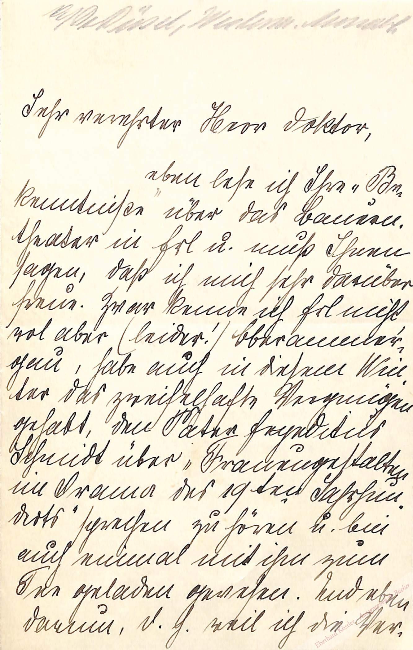 An Dr. Düsel, Redakteur von Westermanns Monatsheften. Enthält abfällige Bemerkungen über das bayrischen Bauerntheater und die Oberammergauer Passionsspiele. – Die erfolgreiche Schriftstellerin war Mitglied im „Verein für Fraueninteressen“. – Mit Beilage.