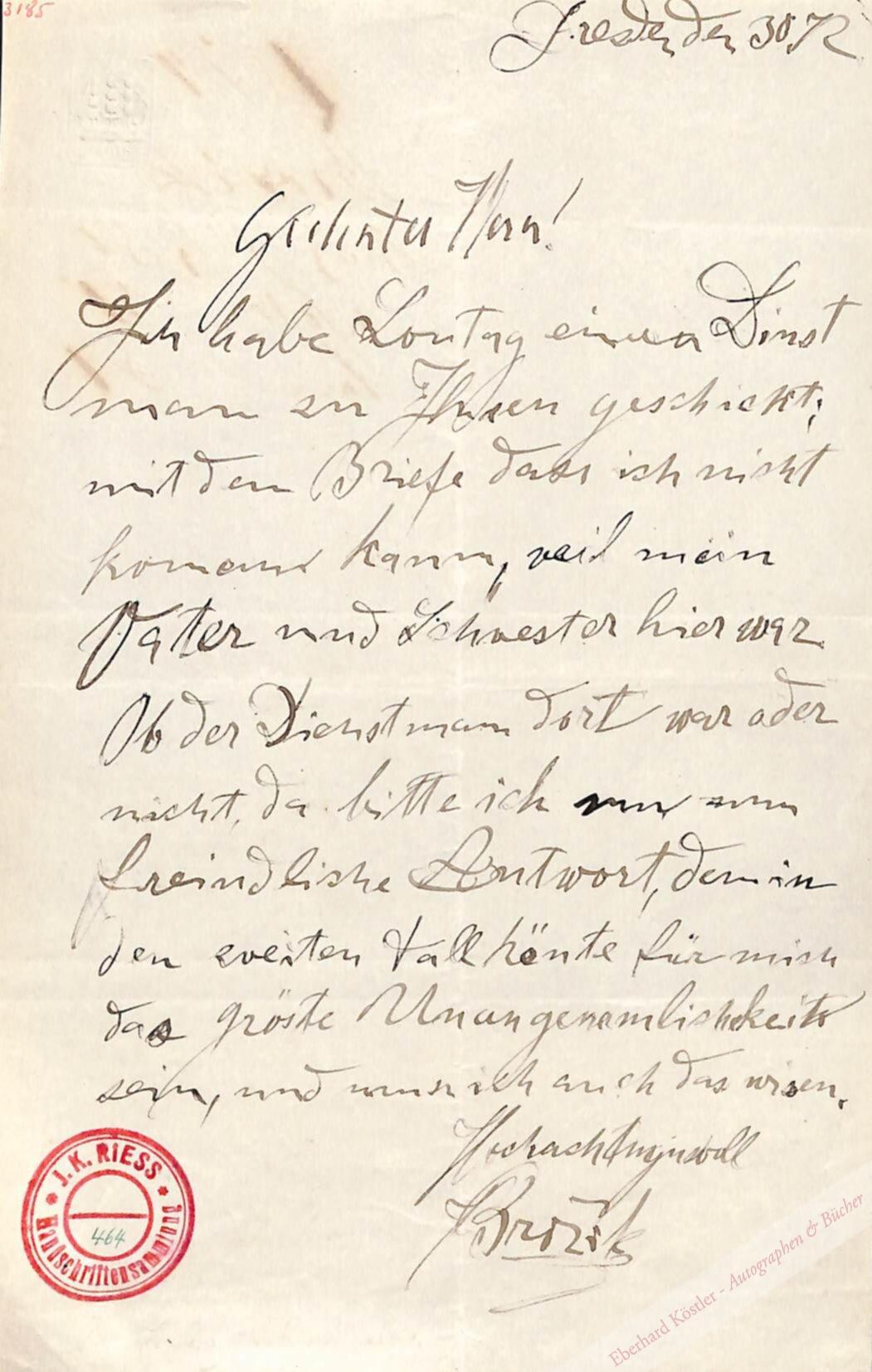 „Geehrter Herr! Ich habe Sonntag einen Dinstmann zu Ihnen geschickt; mit den Briefe dass ich nicht komen kann, weil mein Vater und Schwester hier warn. Ob der Dienstmann dort war oder nicht, da bitte ich mir nun freindliche Antwort, den in den zweiten Fall könte für mich das gröste Unangemlichkeit sein, und muss ich auch das wissen.“ – Mit rotem Sammlungsstempel.
