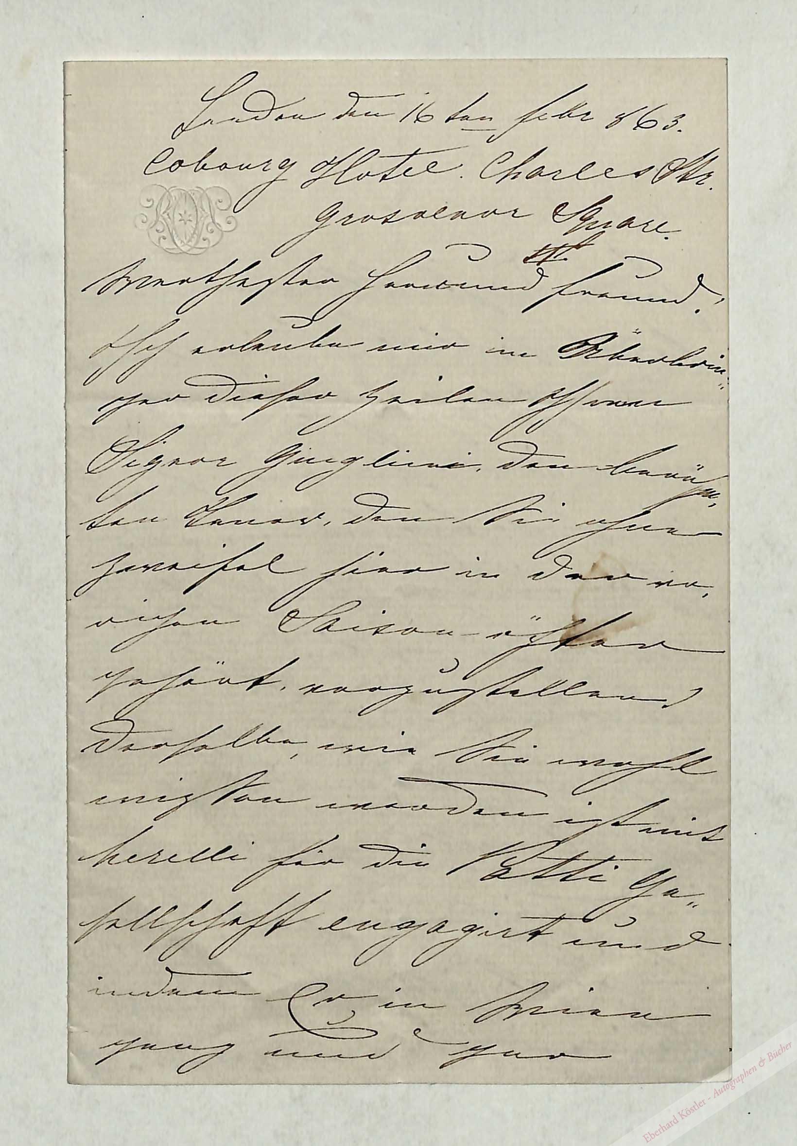 Die bekannte Sängerin empfiehlt Eduard Hanslick einen italienischen Kollegen, den Tenor Guiglini, der nach Wien engagiert wurde.