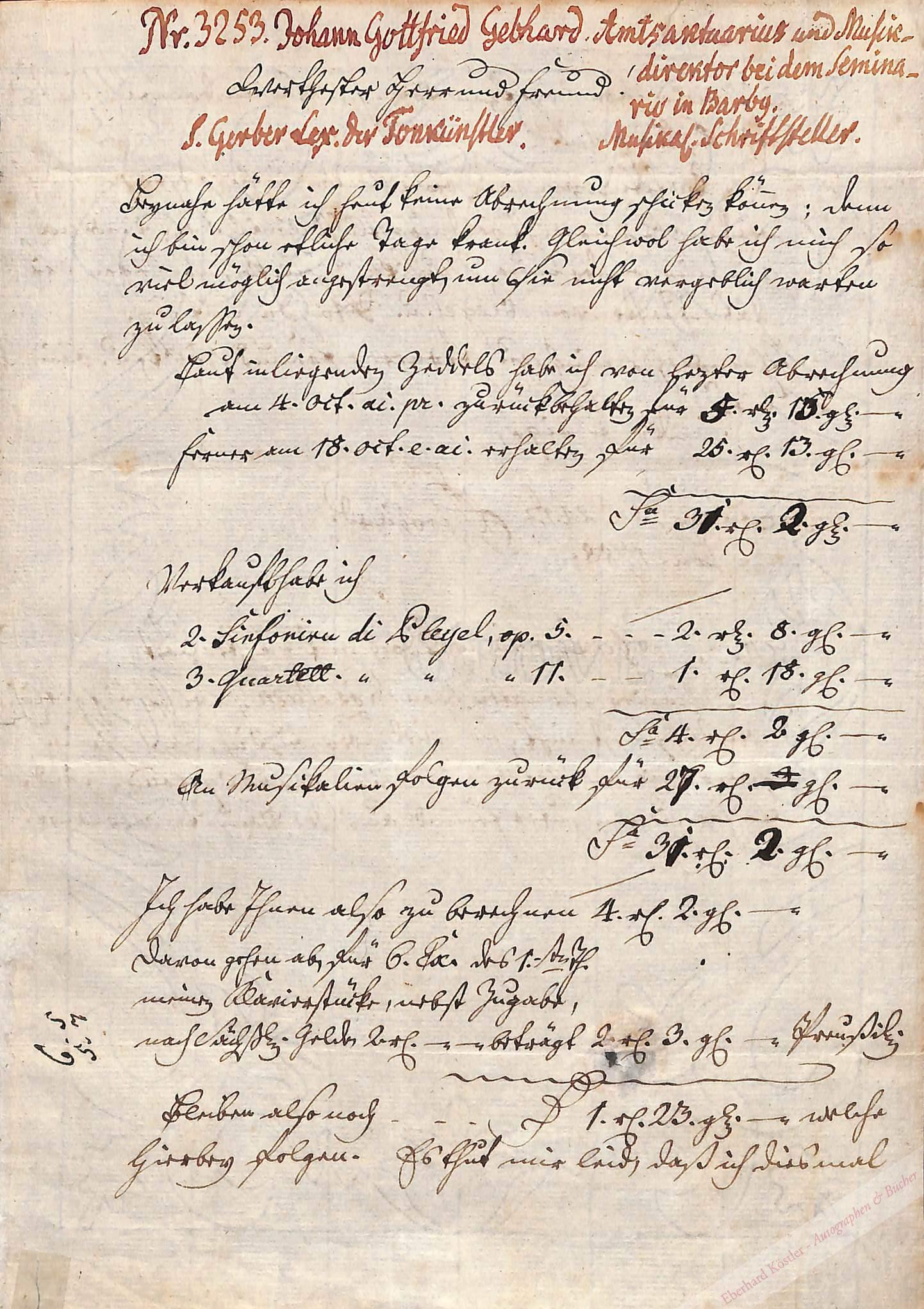 Abrechnung diverser Musikalien, z. B. Verkauf von Sinfonien und Quartetten von Pleyel sowie eigenen Kompositionen. Bittet bei der nächsten Sendung „das neueste von Pleyel und Haydn“ beizulegen sowie eine Sonate von Kozeluch. – Der bei Gerber (neu), Eitner und Mendel erwähnte J. G. Gebhard war Amtssekretär und Musikdirektor am Seminar in Barby (bei Magdeburg) und gab selbst einige Kompositionen heraus. – Biographische Anmerkungen von alter Hand (in roter Tinte). – Aus der Sammlung Rötger.