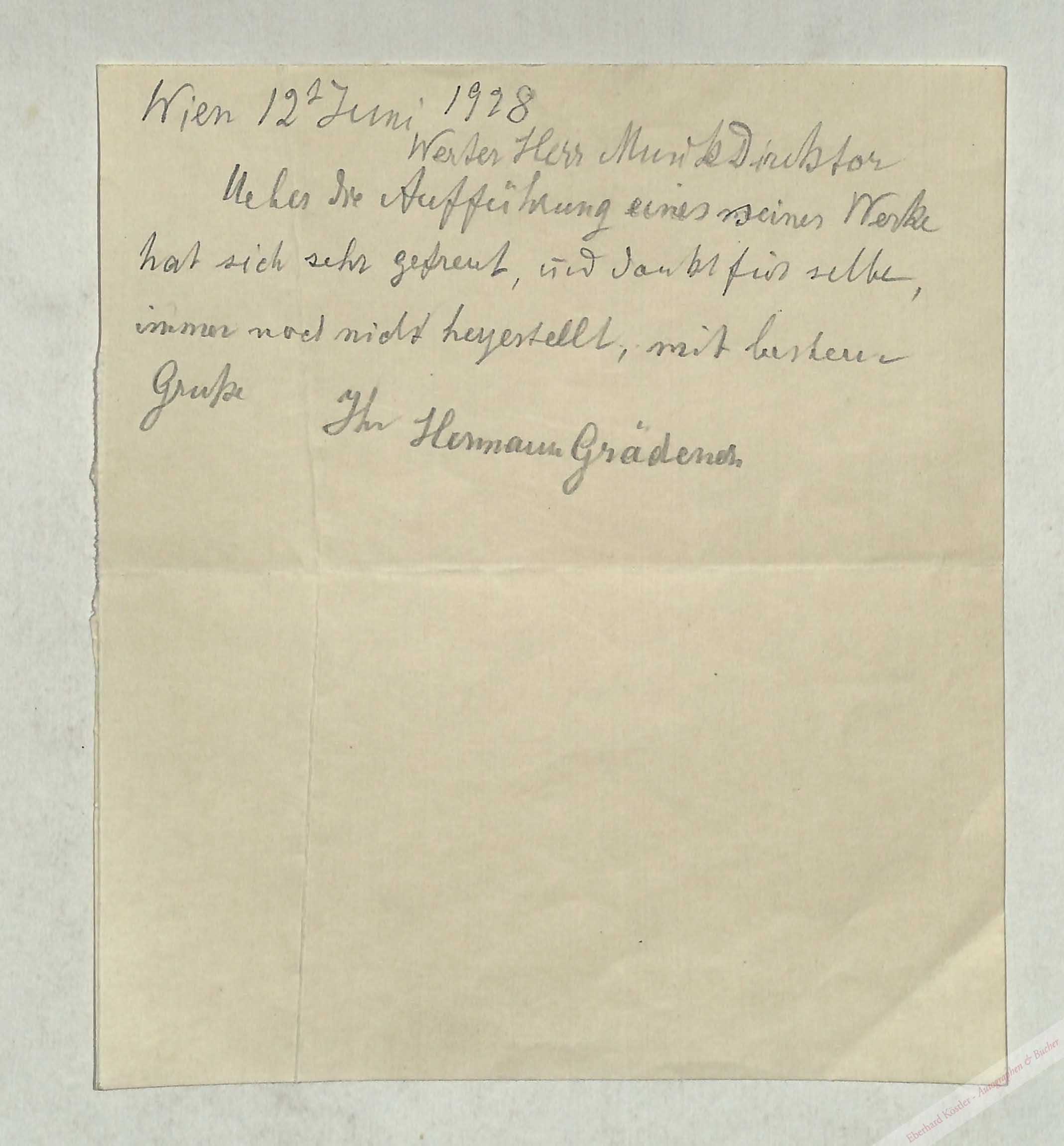 Dankt für die Aufführung eines seiner Werke. – Der Sohn des Komponisten Carl Graedener wirkte in Wien als Organist an der Lutherischen Stadtkirche, als Violinist des Hoforchesterson und unterrichtete von 1877 bis 1913 unterrichtete Musiktheorie am Konservatorium sowie ab 1899 an der Wiener Universität Harmonielehre und Kontrapunkt. Zwischen 1892 und 1896 wirkte er zudem als Dirigent der Wiener Singakademie. Er zählte zum Freundeskreis um Johannes Brahms. – Eigenh. Umschlag liegt bei.
