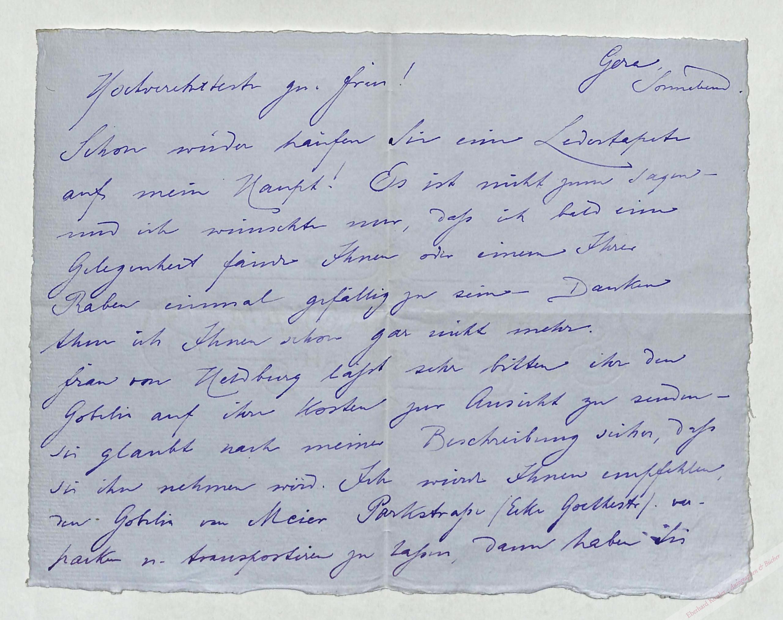 An Hedwig von Holstein, über die Aufführung von „Julius Cäsar“ in Gera: „… ich wünschte mir, daß ich bald die Gelegenheit fände, Ihnen oder einem Ihren Raben einmal gefällig zu sein. Danken kann ich Ihnen schon gar nicht mehr …“ – Die sogenannten „Raben“ waren junge Musiker, die durch das Legat von Franz von Holstein gefördert wurden. – Ferner über den Verkauf eines Gobelins an Frau von Heldburg, Großherzogin von Meiningen.