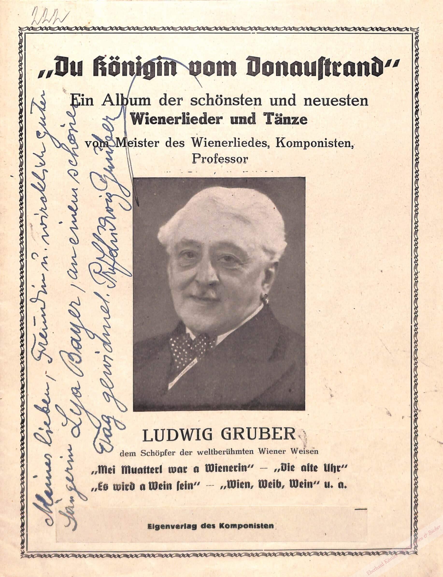 I. „Der allerverehrtesten Künstlerin Lya Beyer zur freundlichenErinnerung an den 11. November 1932 …“ (Mutterl, Dein kleines Wiegenlied! Wien, Blaha, um 1930). – . „Meiner lieben Freundin u. wircklich guten Sängerin Lya Bayer, an einem schönen Tag gewidmet …“ (Du Königin vom Donaustrand. Ein Album der schönsten und neuesten Wienerlieder und Tänze. Wien, Eigenverlag des Komponisten, um 1930). – Zu Grübers bekanntesten Werken zählt „Mei Mutterl war a Weanerin“.