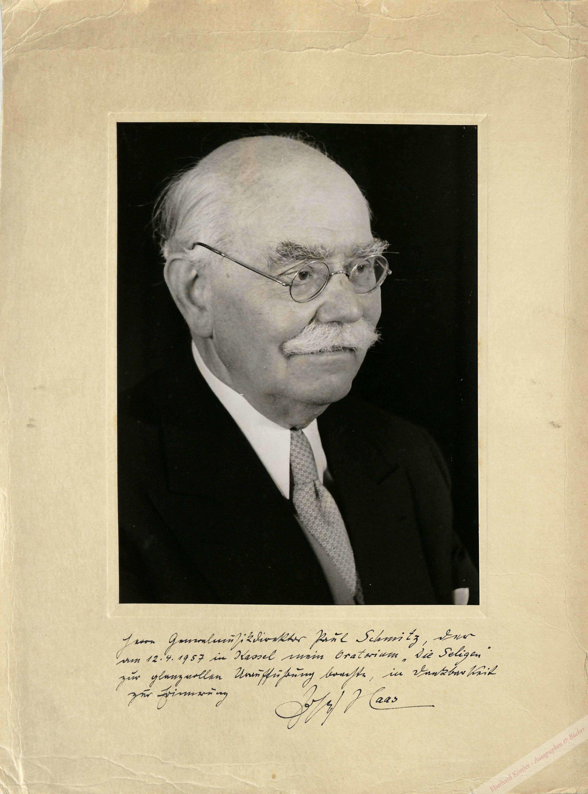 Widmung an Generalmusikdirektor Paul Schmitz, „der am 12. 4. 1957 in Kassel mein Oratorium ‚Die Seligen‘ zur glanzvollen Uraufführung brachte, in Dankbarkeit zur Erinnerung […]“ – Ränder mit Knitterspuren.
