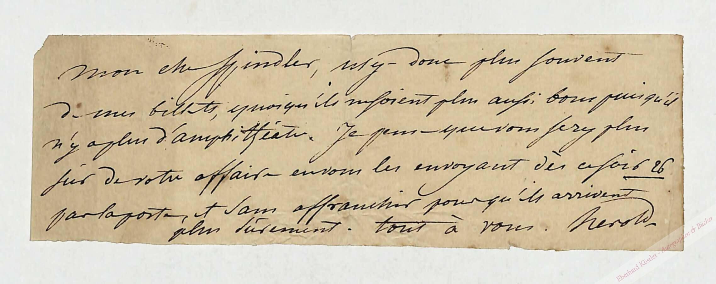 An Monsieur Spindler in französischer Sprache. Hérold bittet ihn, von seinen Billets Gebrauch zu machen, auch wenn sie inzwischen weniger Wert seien, da es kein Amphithéatre mehr gebe.