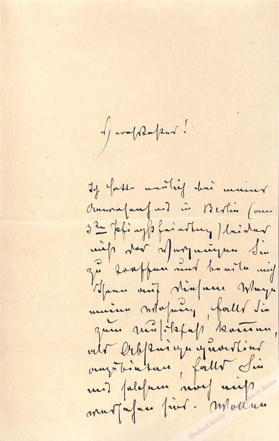 An den Musikschriftsteller Max Kalbeck, der von 1875 bis 1880 in Breslau lebte, mit Anerbieten seiner Wohnung als Absteigequartier anlässlich des Görlitzer Musikfestes.