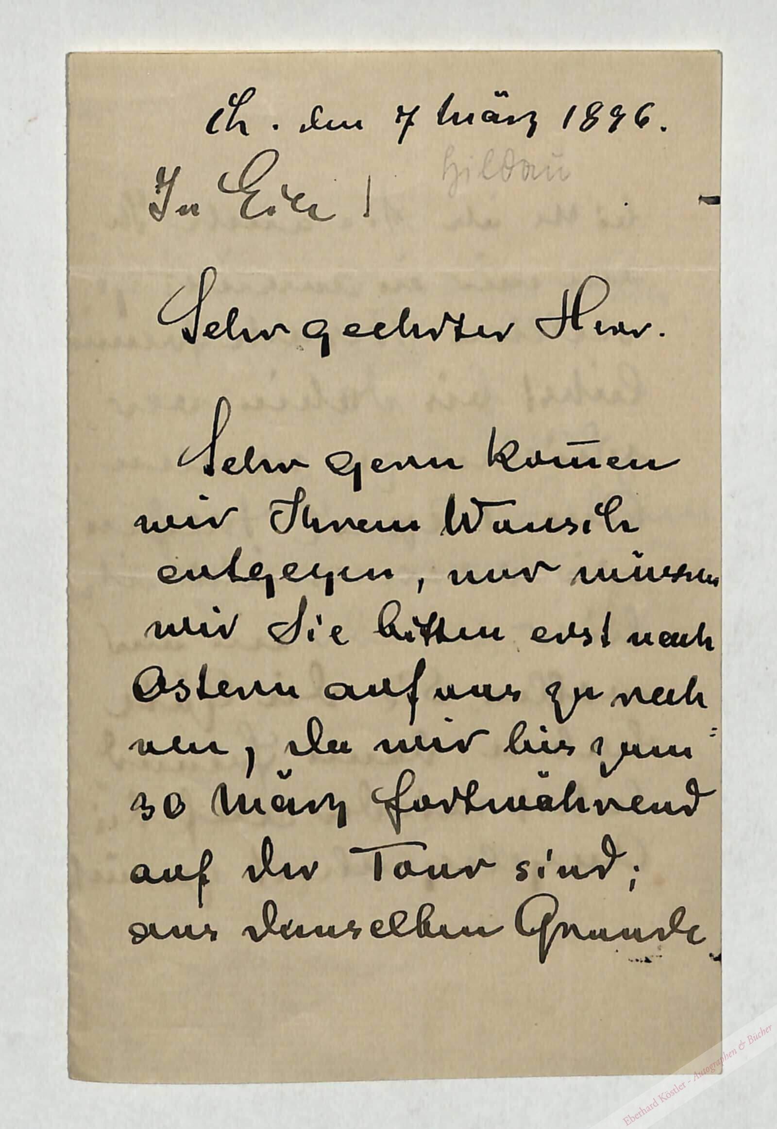 „In Eile! … Sehr gerne kommen wir Ihrem Wunsche entgegen, nur würden wir Sie bitten erst nach Ostern auf uns zu rechnen, da wir bis zum 30. März forthwährend auf der Tour sind; aus demselben Grunde bitte ich Sie auch, Ihren mir in Aussicht gestellt Besuch freundlichst bis dahin verschieben zu wollen. Am 1. April treffen wir voraussichtlich hier wieder ein …“ – Hildach, später einer der führenden Gesangspädagogen seiner Zeit, war mit der Sängerin Anna Schubert verheiratet. Das Paar unternahm ausgedehnte Konzertreisen in ganz Europa.