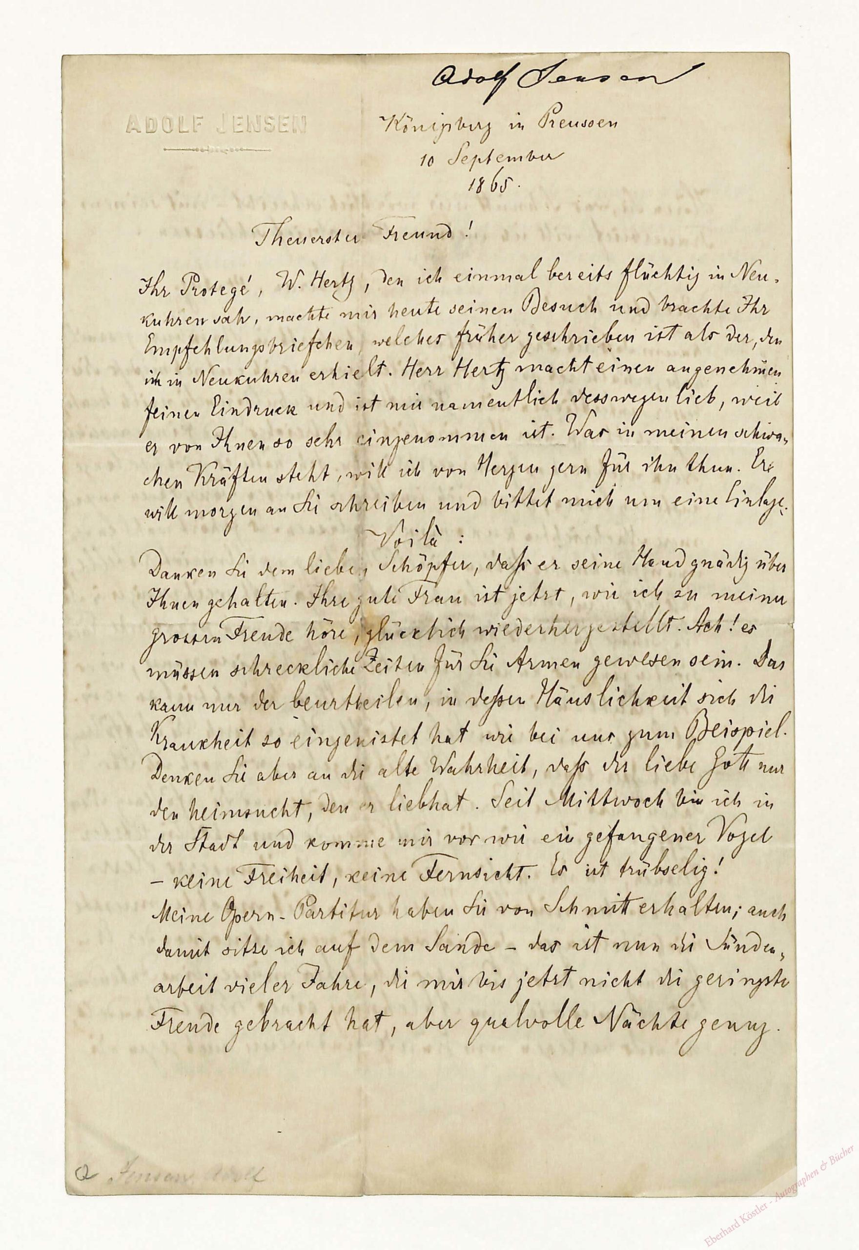 Schöner Brief an einen Freund. Jensen ist tief enttäuscht über die Ablehnung seiner Oper [„Die Erbin von Montfort“, später von Wilhelm Kienzl zu „Turandot“ umgearbeitet] und gibt dazu wörtlich das Schreiben von G. Alois Schmitt (1827-1902), dem damaligen Hofkapellmeister in Schwerin wieder: „[…] Mit seinem Trauerbrief will ich meinen Trauerbrief schliessen […]“ – 1860 kam Jensen nach Königsberg und gelangte dort schnell zu Ansehen als Komponist und als Lehrer. 1866 erhielt er einen Ruf als Professor für Klavier nach Berlin an Tausigs „Schule für das höhere Klavierspiel“. Dort lehrte er bis 1868, siedelte dann nach Dresden um und zog 1870 nach Graz. Hier lebte er bis 1875. Seine letzten vier Lebensjahre verbrachte er in Baden-Baden, wo er regelmäßigen Kontakt mit seinem Freund Johannes Brahms hatte.