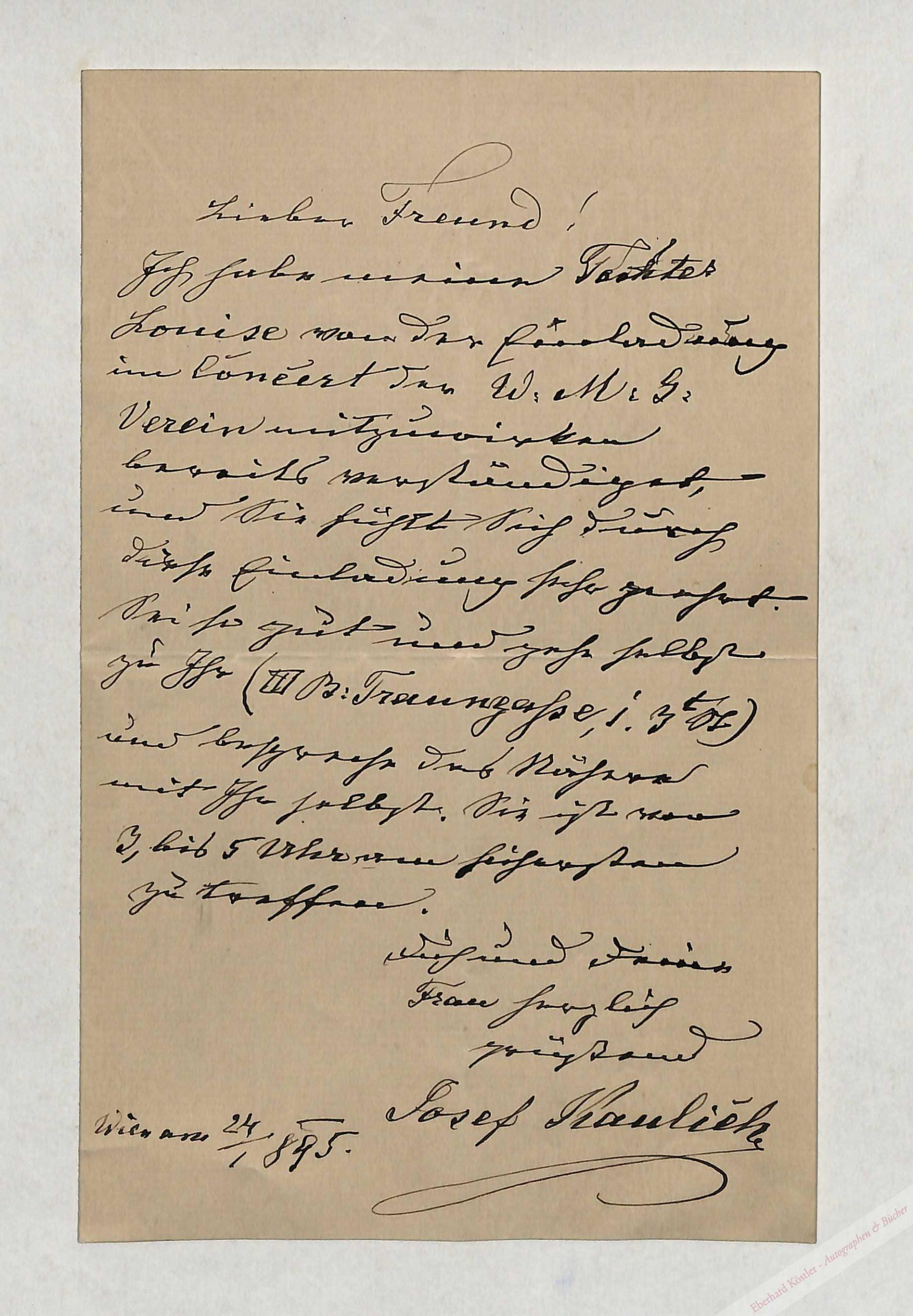 An Eduard Kremser wegen Verpflichtung seiner Tochter, im Wiener Männergesang-Verein mitzuwirken.