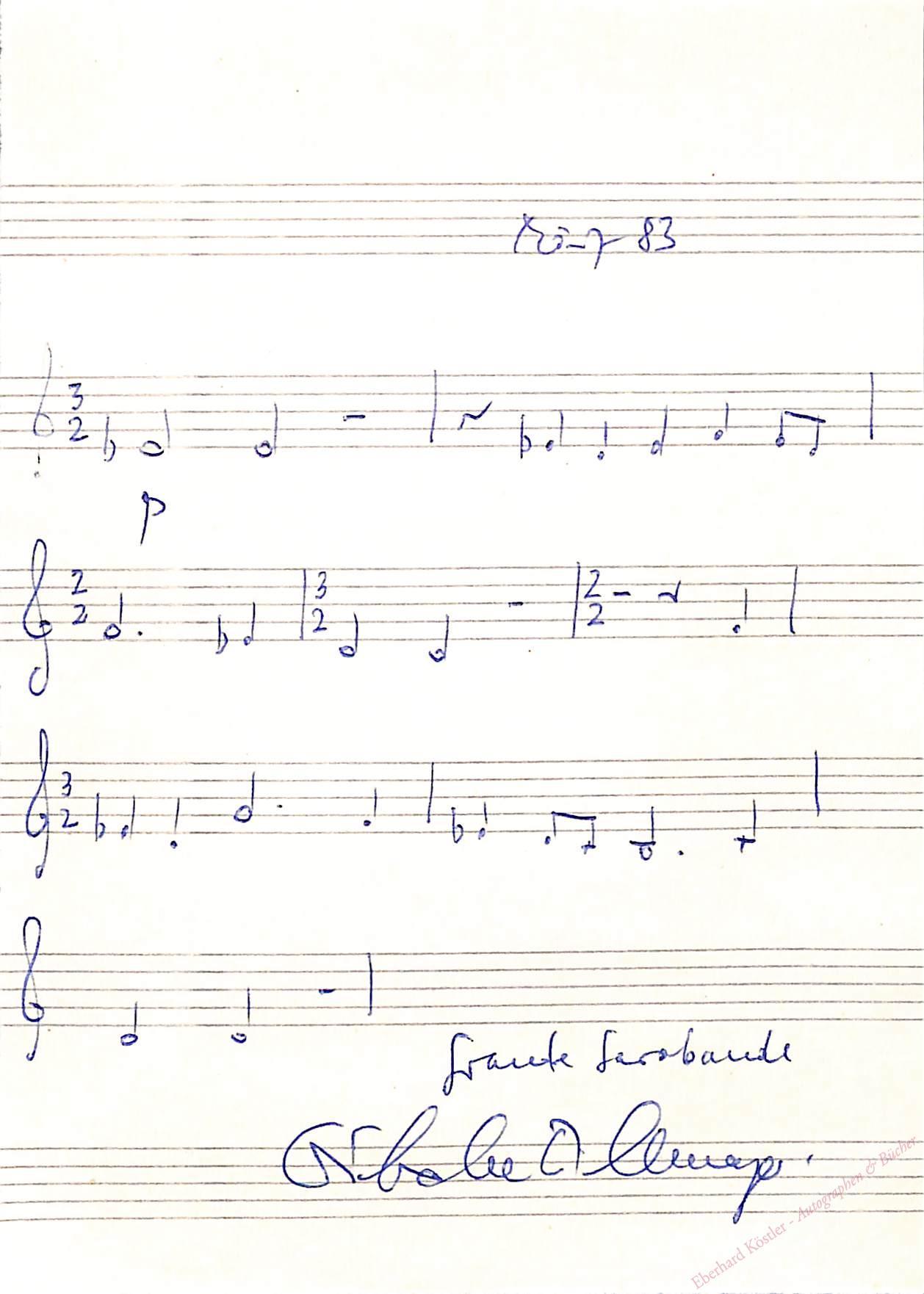 Eigenhändiges musikalisches Albumblatt mit Unterschrift München, März 1983, Kl.-8°. 1 Seite. Umschlag – Aus der „Grande Sarabande“.