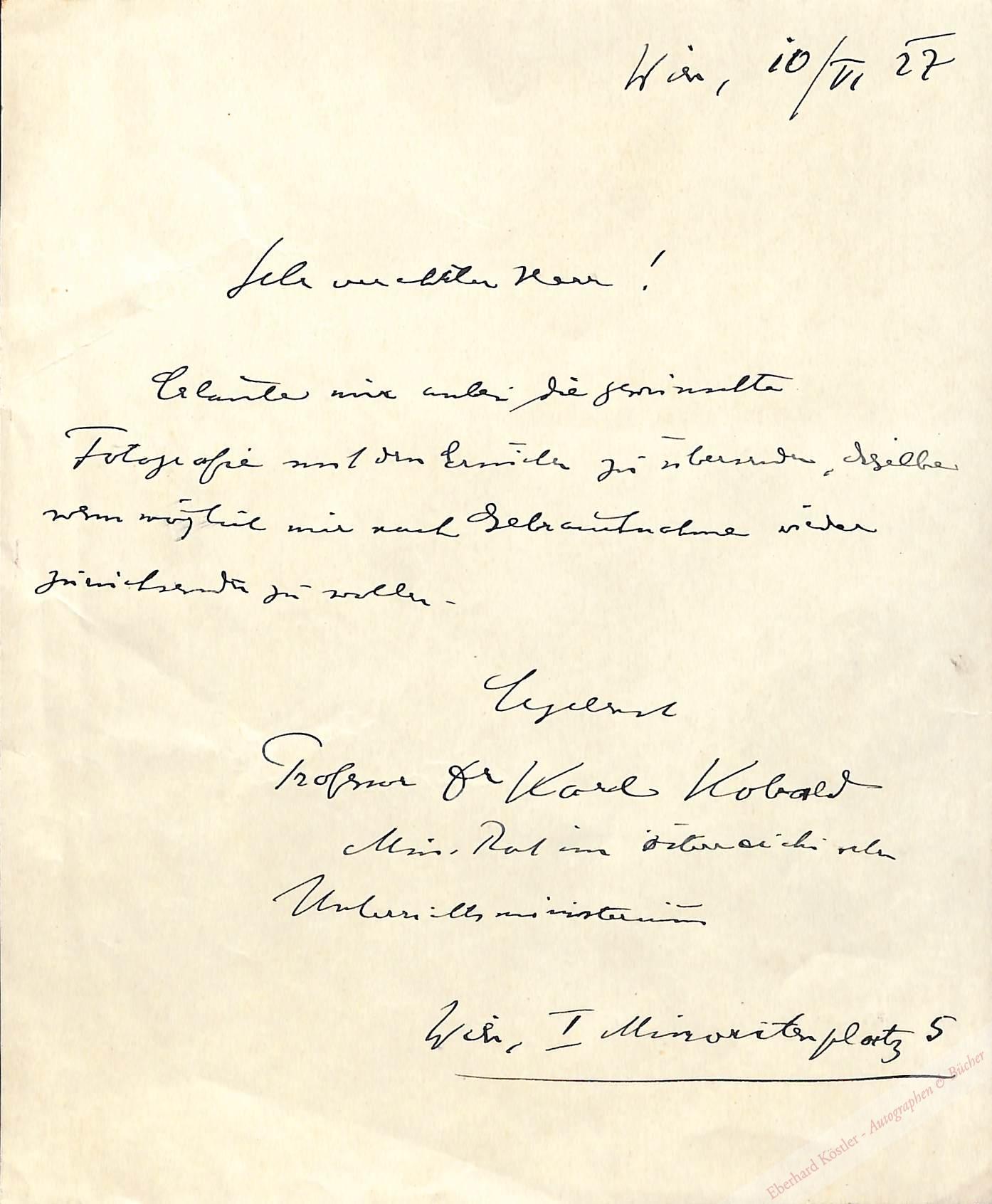 Eigenhändiger Brief mit Unterschrift Wien, 16. VI. 1927, 21,5 x 18 cm. 1 Seite.