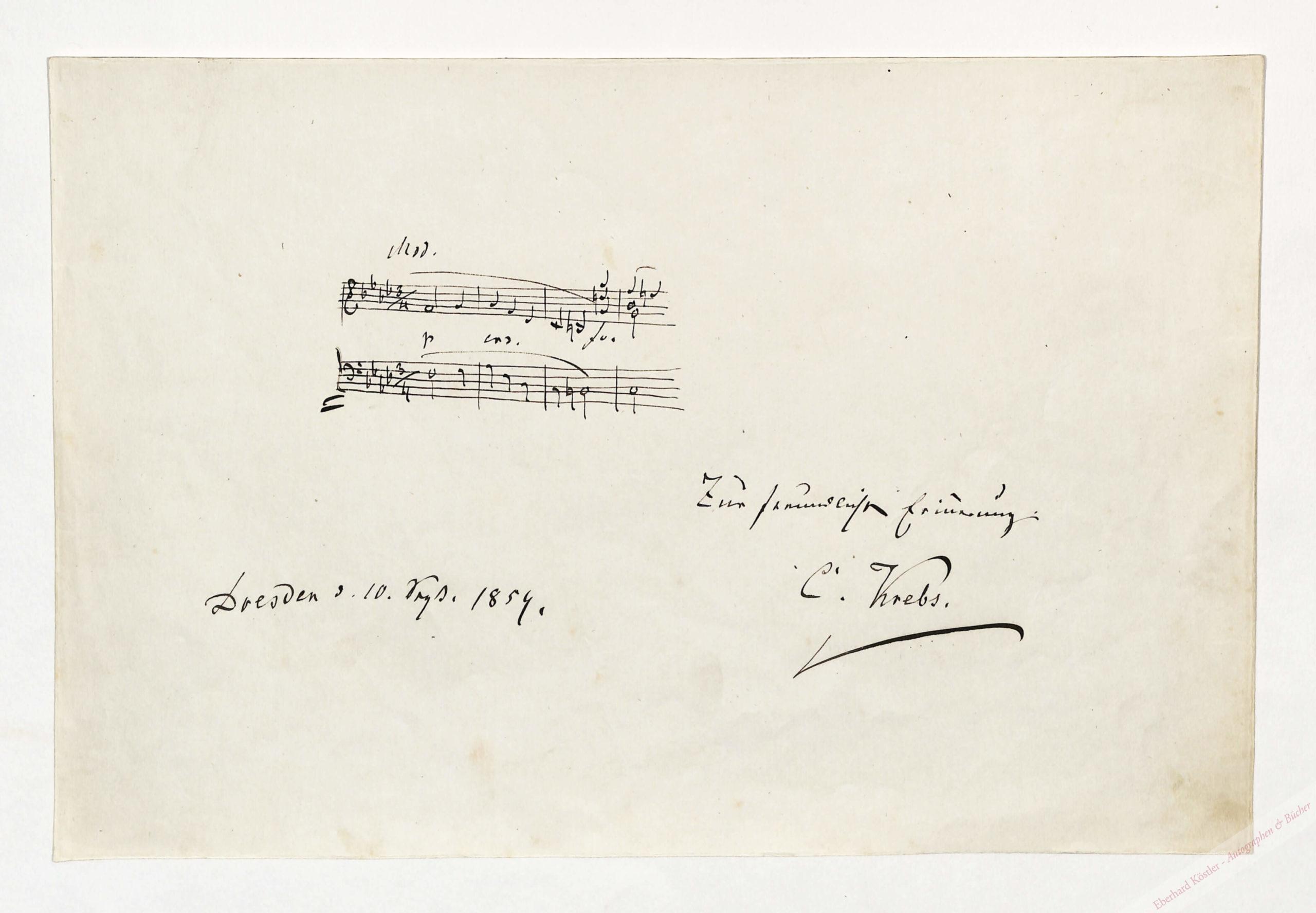 4-taktiges Incipit in f-Moll (Moderato). – Der deutsche Dirigent Karl August Krebs (Nürnberg 1804-1880 Dresden) wurde 1826 „3. Kpm. am Wiener Kärntnertortheater, wirkte 1827 bis 1850 am Hamburger Stadttheater und übernahm anschließend Wagners Stelle an der Dresdner Hofoper, wo er am 6. Aug. 1859 u. a. die Erstaufführung des ‚Lohengrin‘ dirigierte. Nach seinem Ausscheiden aus dem Theaterdienst leitete er die Kirchenmusik an der kath. Hofkirche […] Krebs‘ umfangreiches Schaffen richtete sich an den Geschmack des breiten Publikums. Im Mittelpunkt stehen die zahlreichen Lieder und Gesänge, von denen manche sehr beliebt waren“ (MGG).