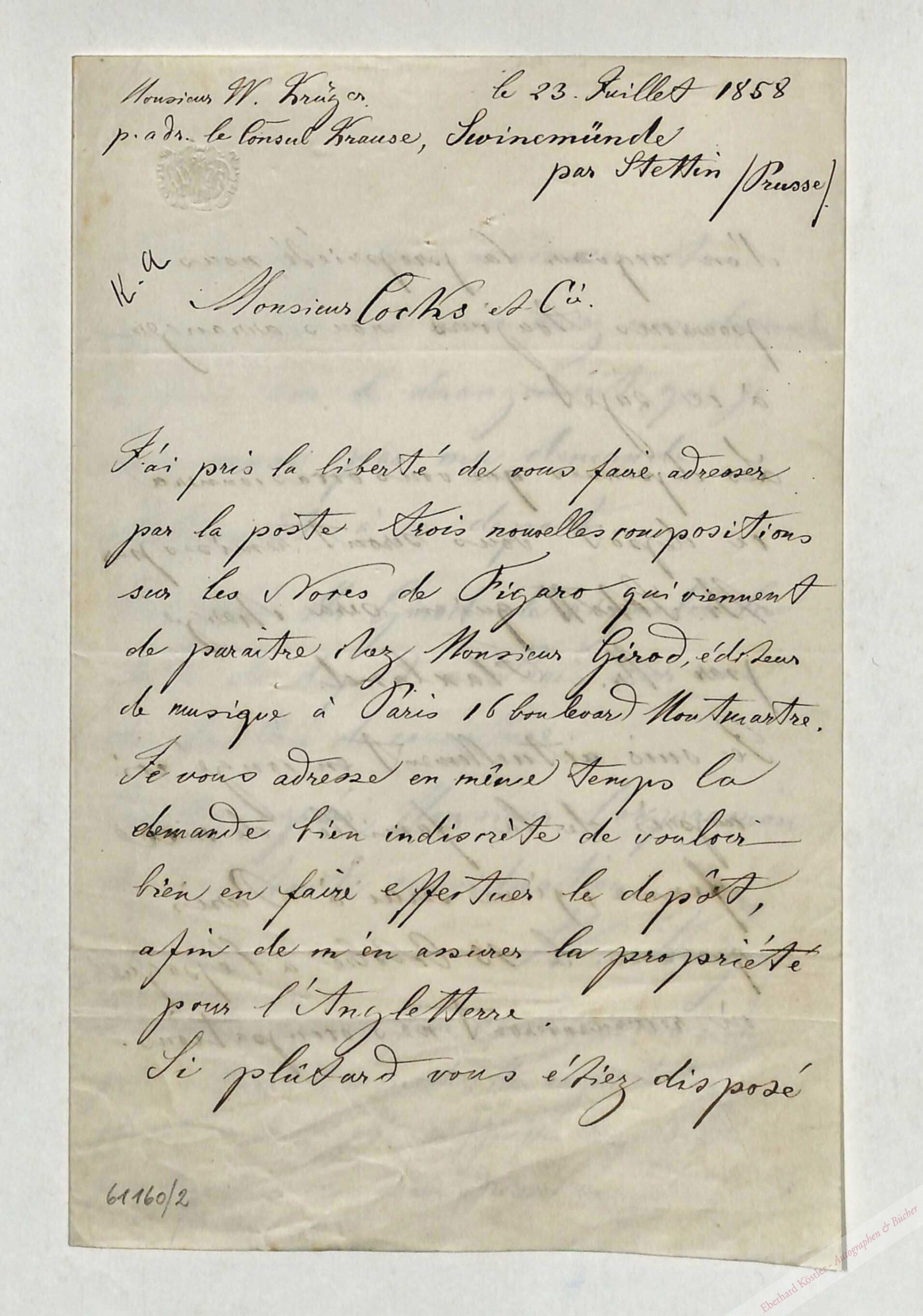 „J’ai pris la liberté de vous faire adresser par la poste trois nouvelles compositions sur les Noces de Figaro qui viennent de paraitre chez Monsieur Girod, éditeur de musique à Paris…“. – Von 1845 bis 1870 wirkte Krüger in Paris, unter anderem als Liedbegleiter. Er wird mit Einträgen vom Januar und Februar 1842 im Haushaltstagebuch von Clara Schumann und den Ehetagebüchern von Clara Schumann und Robert Schumann erwähnt.