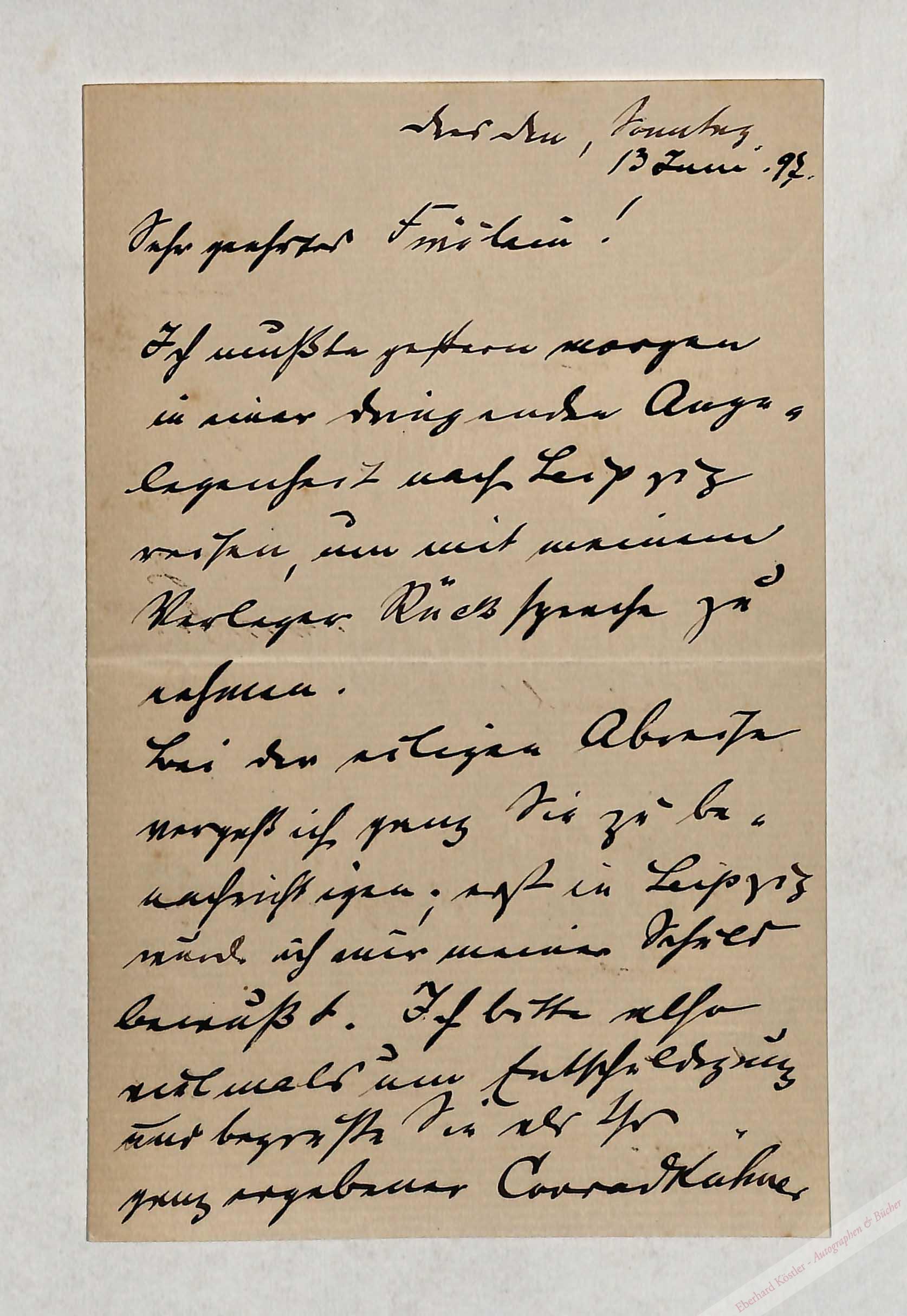„…Ich mußte gestern morgen in einer dringenden Angelegenheit nach Leipzig reisen, um mit meinem Verleger Rücksprache zu nehmen. Bei der eiligen Abreise vergaß ich ganz Sie zu benachrichtigen; erst in Leipzig wurde ich mir meiner Schuld bewußt. Ich bitte also vielmals um Entschuldigung…“ – Kühner wirkte u. a. als Klavierlehrer in Braunschweig.