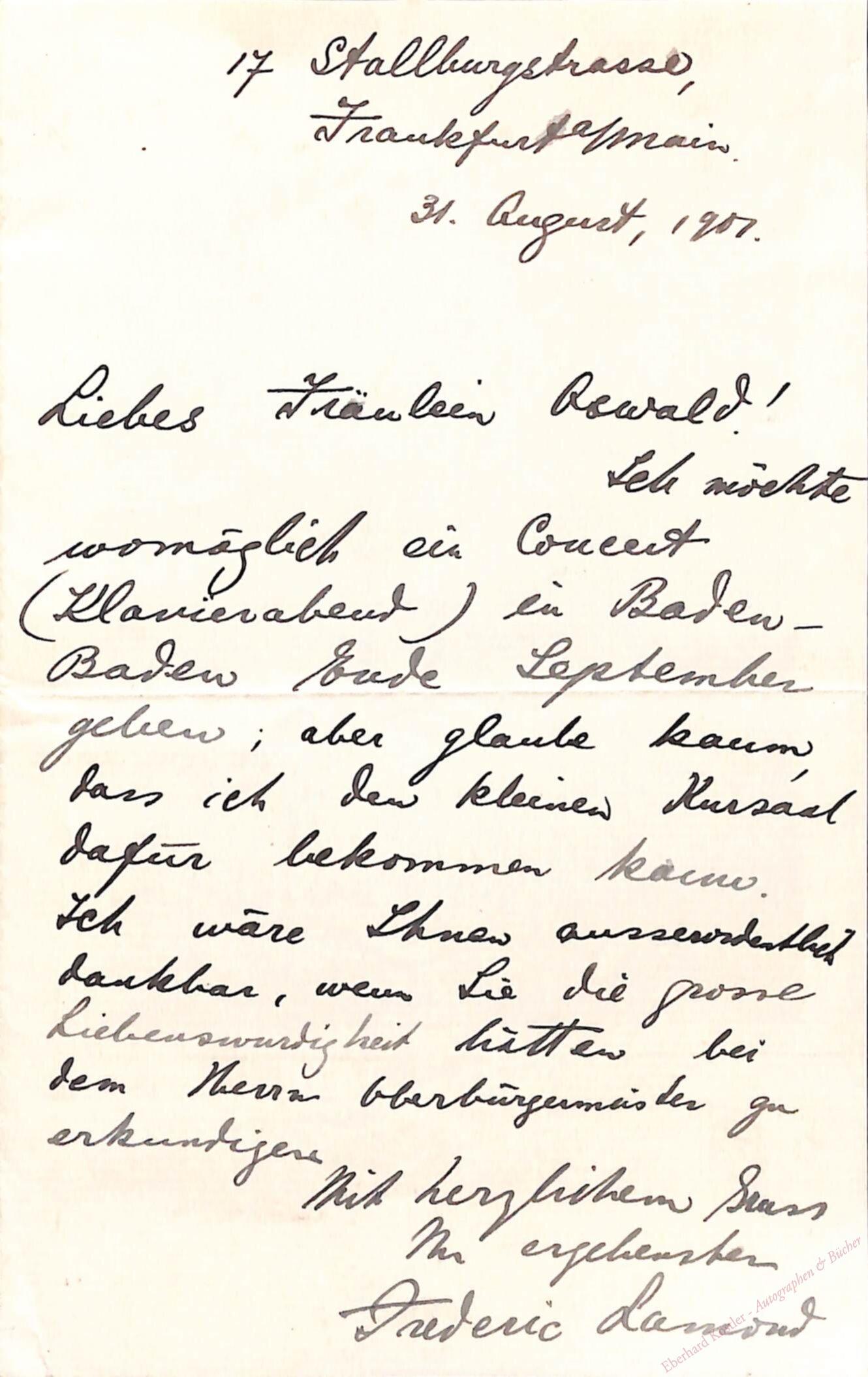 „Liebes Fräulein Rewald! Ich möchte womöglich ein Concert (Klavierabend) in Baden-Baden Ende September geben, aber glaube kaum, dass ich den kleinen Kursaal dafür bekommen kann. Ich wäre Ihnen ausserordentlich dankbar, wenn Sie die ganze Liebenswürdigkeit hätten, bei dem Herrn Oberbürgermeister zu erkundigen …“. – Beiliegend ein Konzertprogramm „Frederic Lamond Klavierabend“ am 12. März 1937 im Kursaal Baden-Baden.