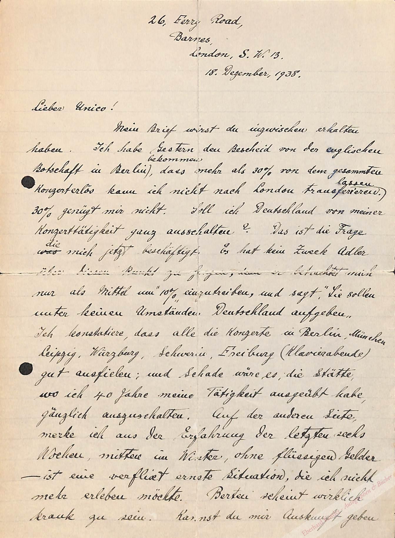 An den Verleger Unico Hensel mit Schilderung seiner prekären Situation. „Soll ich Deutschland von meiner Konzerttätigkeit ganz ausschalten? Das ist die Frage die mich jetzt beschäftigt.“ Erwähnt u.a. Toscanini, Backhaus und Schnabel.
