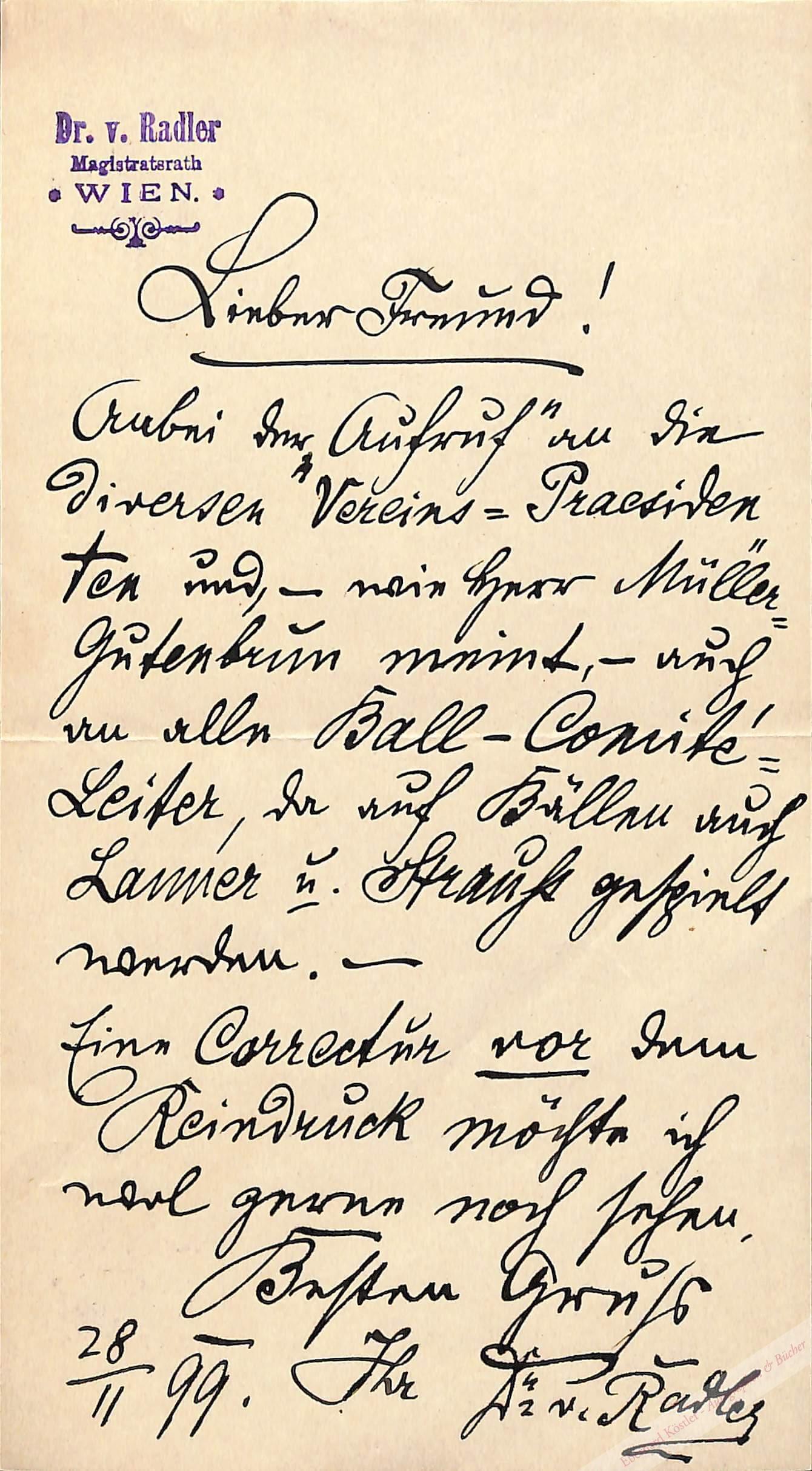 An seine Druckerei. – Erwähnt den Schriftsteller Adam Müller-Guttenbrunn (1852-1923) und Bälle, auf denen auch Lanner und Strauß gespielt werden. – Radler ist der Verfasser des Lebensbildes „Joseph Lanner“, das mit Musik von L. Gothov-Grünecke nach Lanner am 10. IX. 1880 im Josephstädter Theater erstmals aufgeführt wurde.