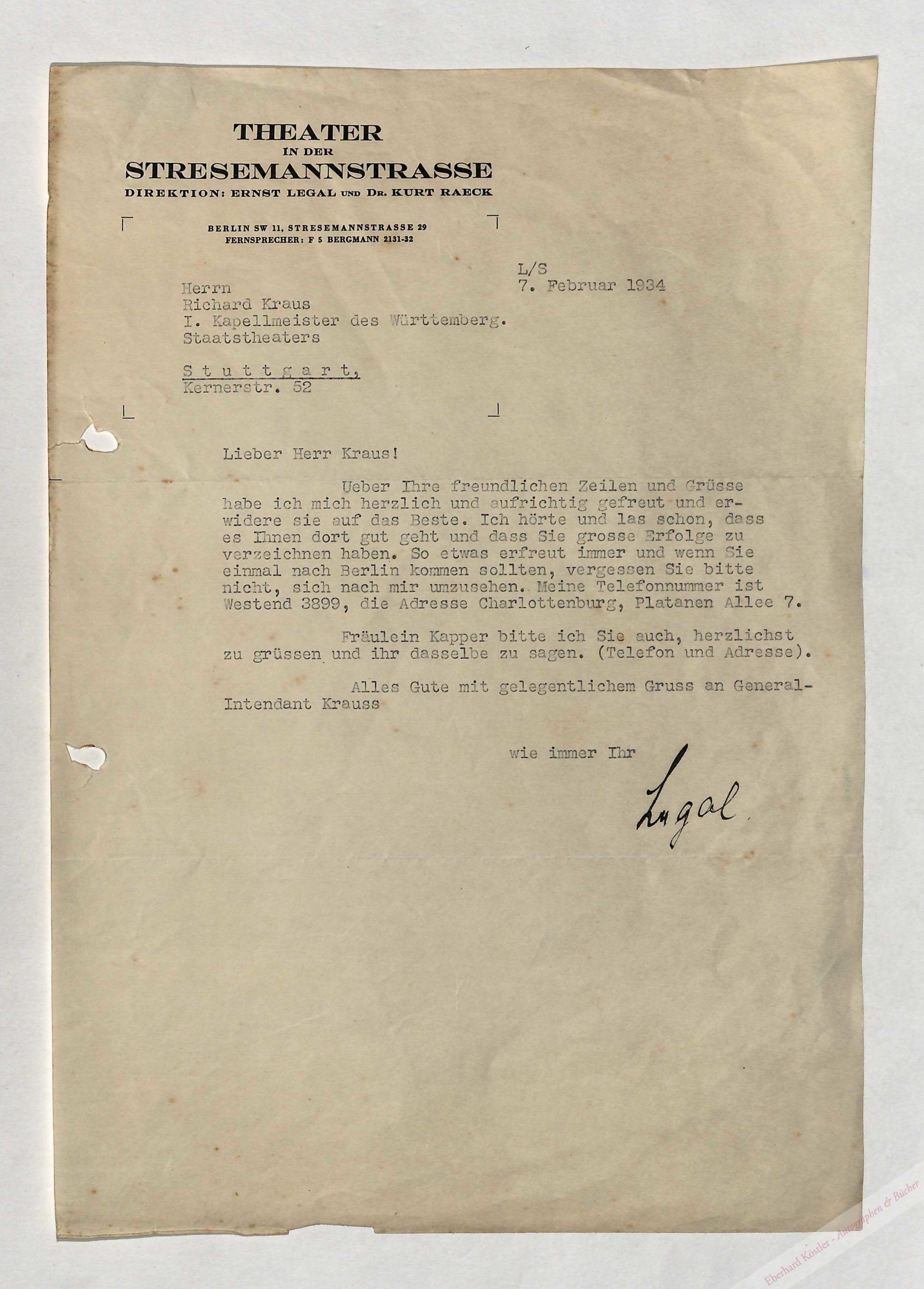 An Richard Kraus, dem er dankt und den er einlädt. – Legal wirkte als Regisseur und Intendant in Darmstadt, Kassel und vor allem in Berlin.