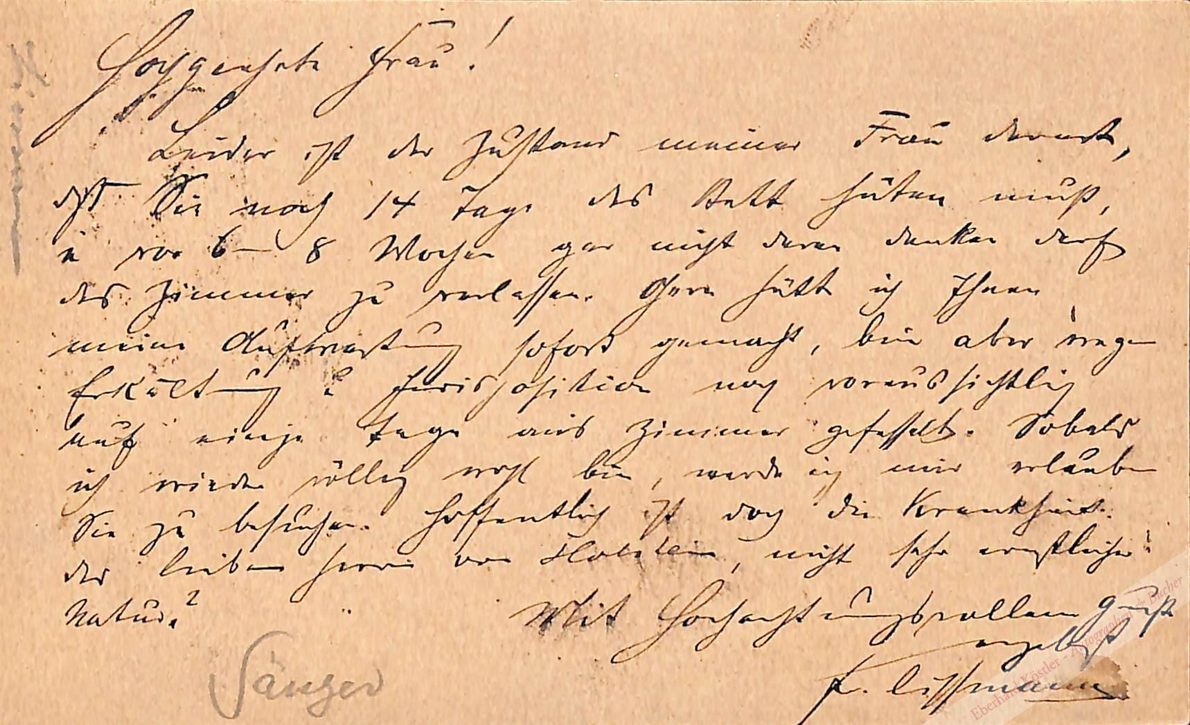 An Hedwig v. Holstein wegen eines geplanten Besuches. – Der in Berlin geborene Sänger wurde 1883 als Nachfolger von Eugen Gura nach Hamburg berufen.