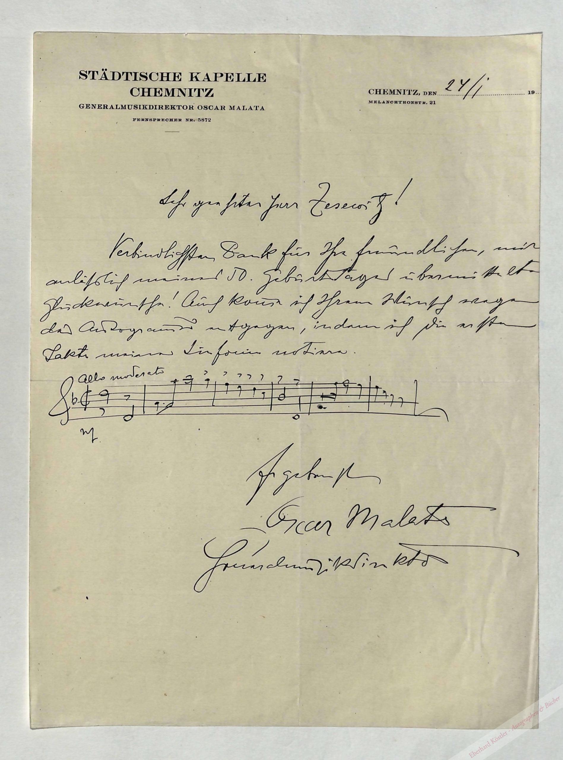 Eigenhändiger Brief mit Unterschrift Chemnitz, 24. I. 1925, (28,5 x 22,5 cm). 1 Seite. Mit gedrucktem Briefkopf “ Städtische Kapelle Chemnitz“.