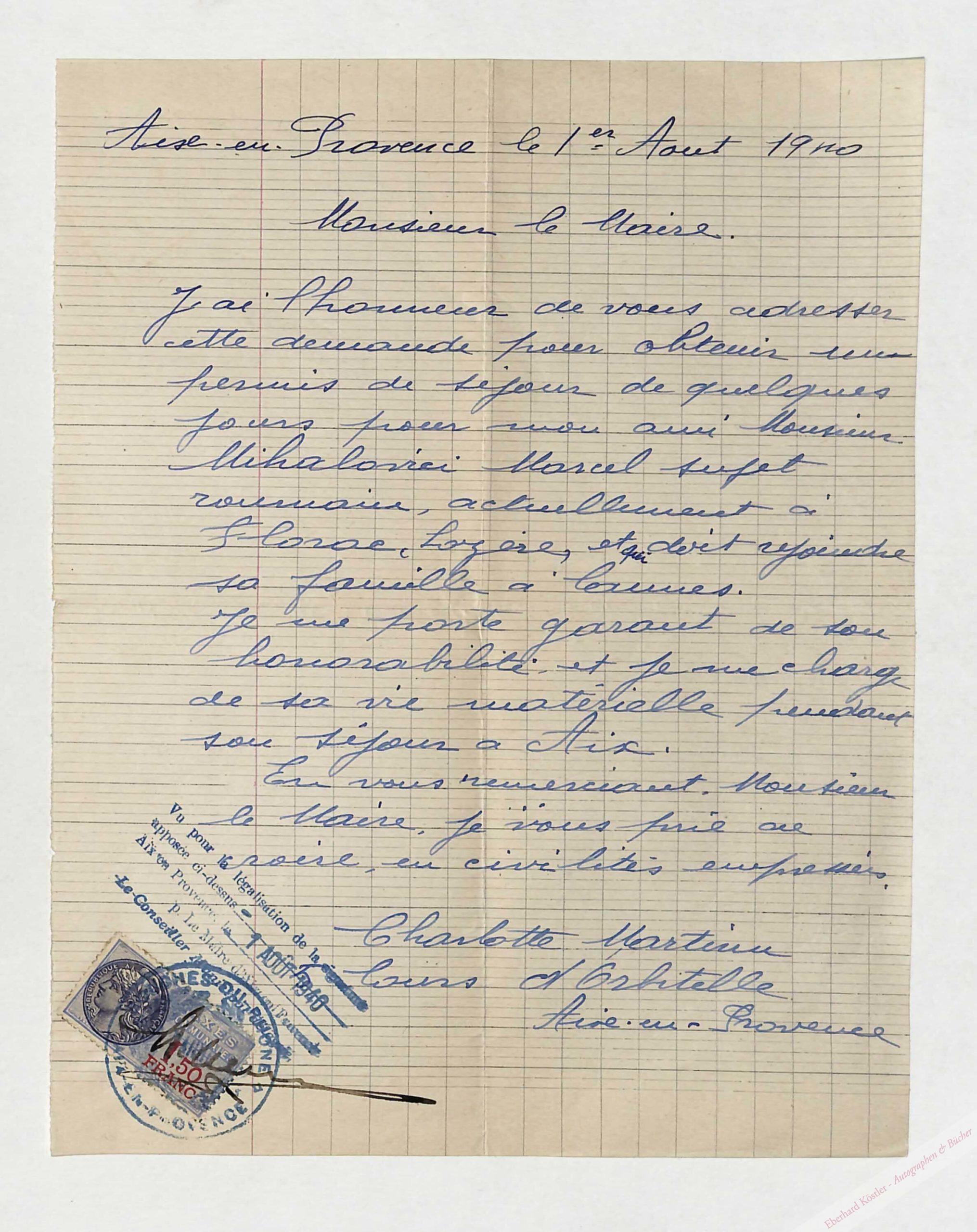 An Maise, den Bürgermeister von Aix, dem gegenüber sie sich für den Komponisten Marcel Mihalovici verbürgt, der zu Besuch kommen wird.