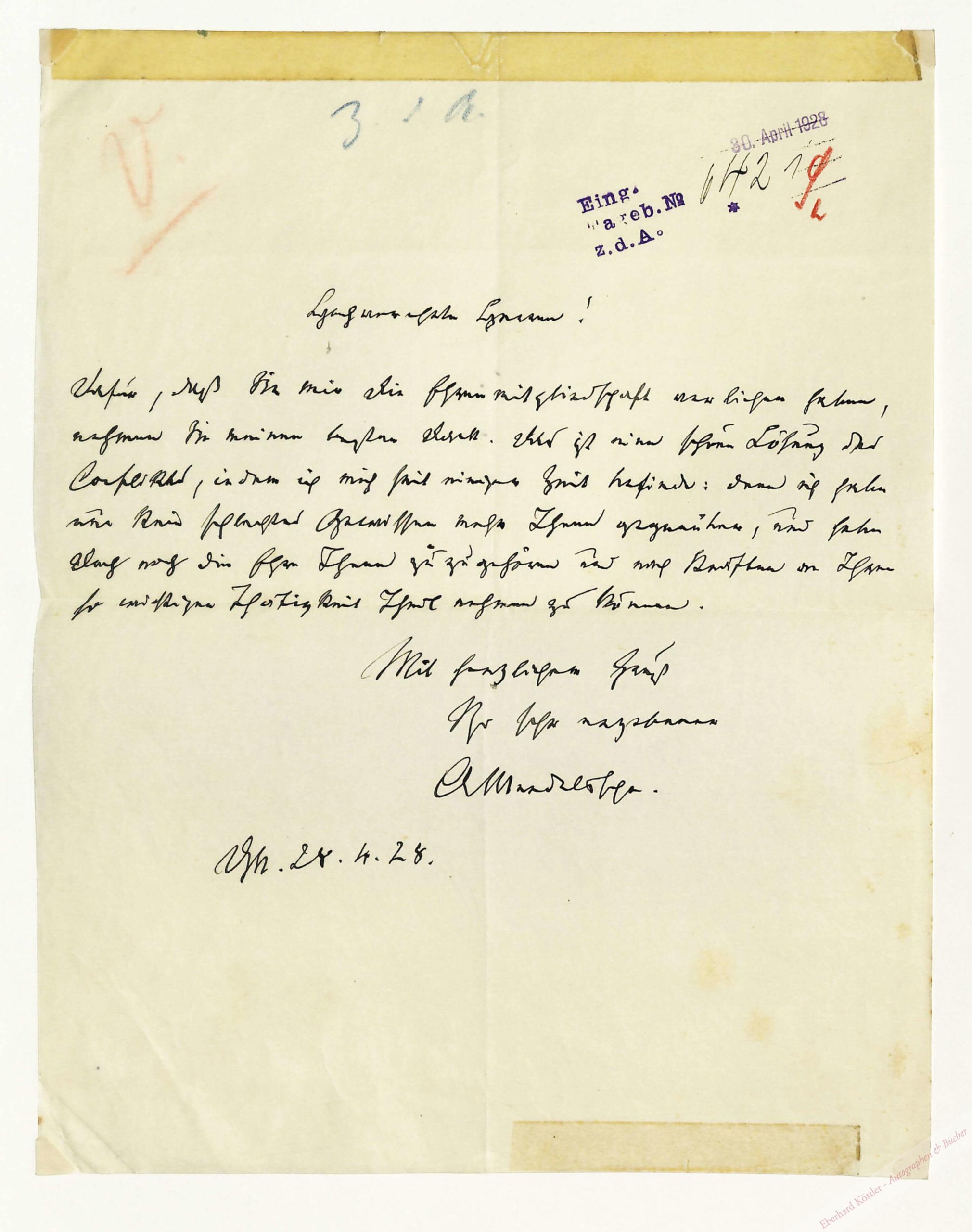 Dankt für die Verleihung einer Ehrenmitgliedschaft, so daß er nun kein schlechtes Gewissen mehr haben müsse. – Mendelssohn wirkte seit 1891 als Kirchenmusikmeister in Darmstadt. Mit der in diesem Amt entfalteten organisatorischen und kompositorischen Tätigkeit leitete er eine Reform der evangelischen Kirchenmusik in Deutschland ein. Zu seinen Schülern gehört Paul HIndemith. – Eingangsstempel; Ränder mit Klebefilm ausgebessert.