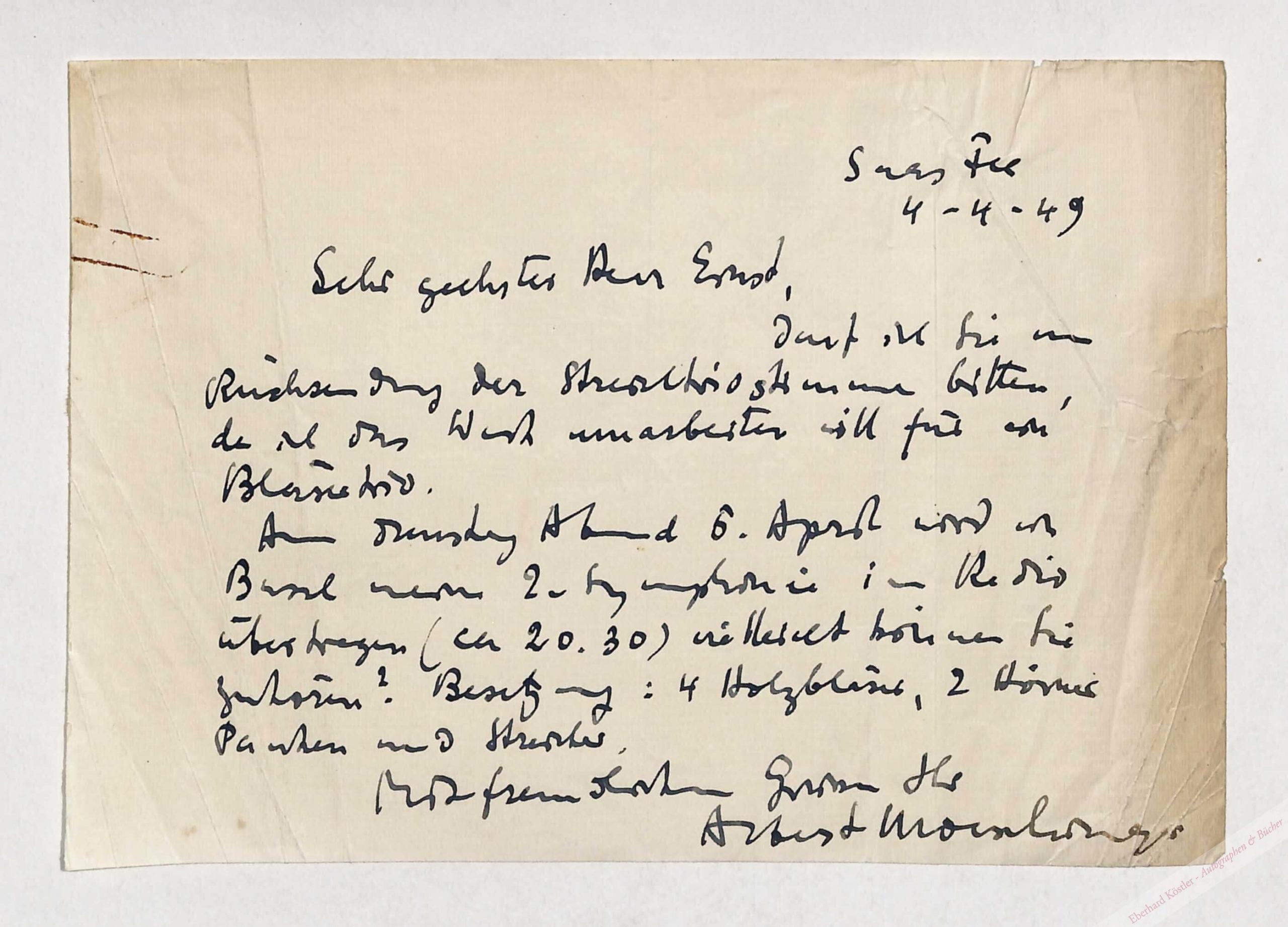 An Ernst Moeschinger; bittet um Rücksendung der Stimmen zum Streichtrio, da er dieses für Bläser umarbeiten will.