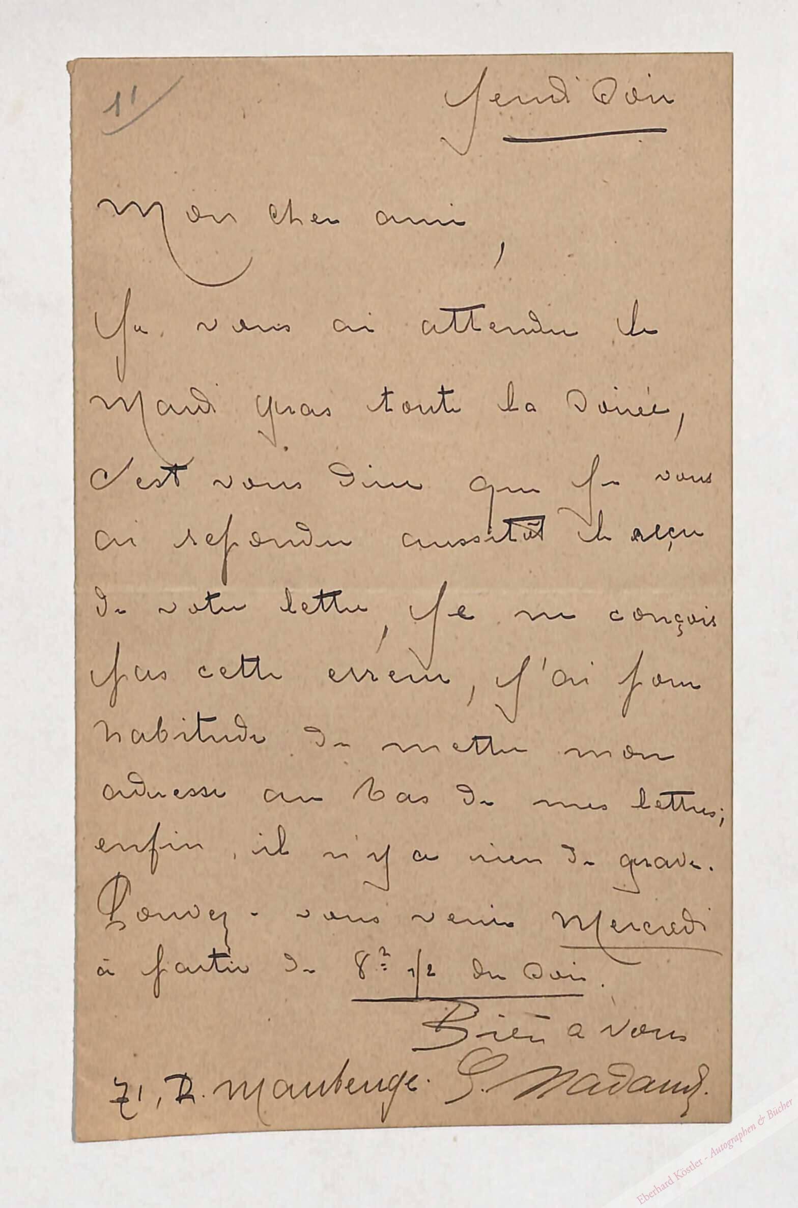 Wiederholte Verabredung mit einem Herren, der irrtümlich die Adresse von Nadaud verfehlt hatte. „… j´ai pour habitude de mettre mon adresse au bas de mes lettres…“