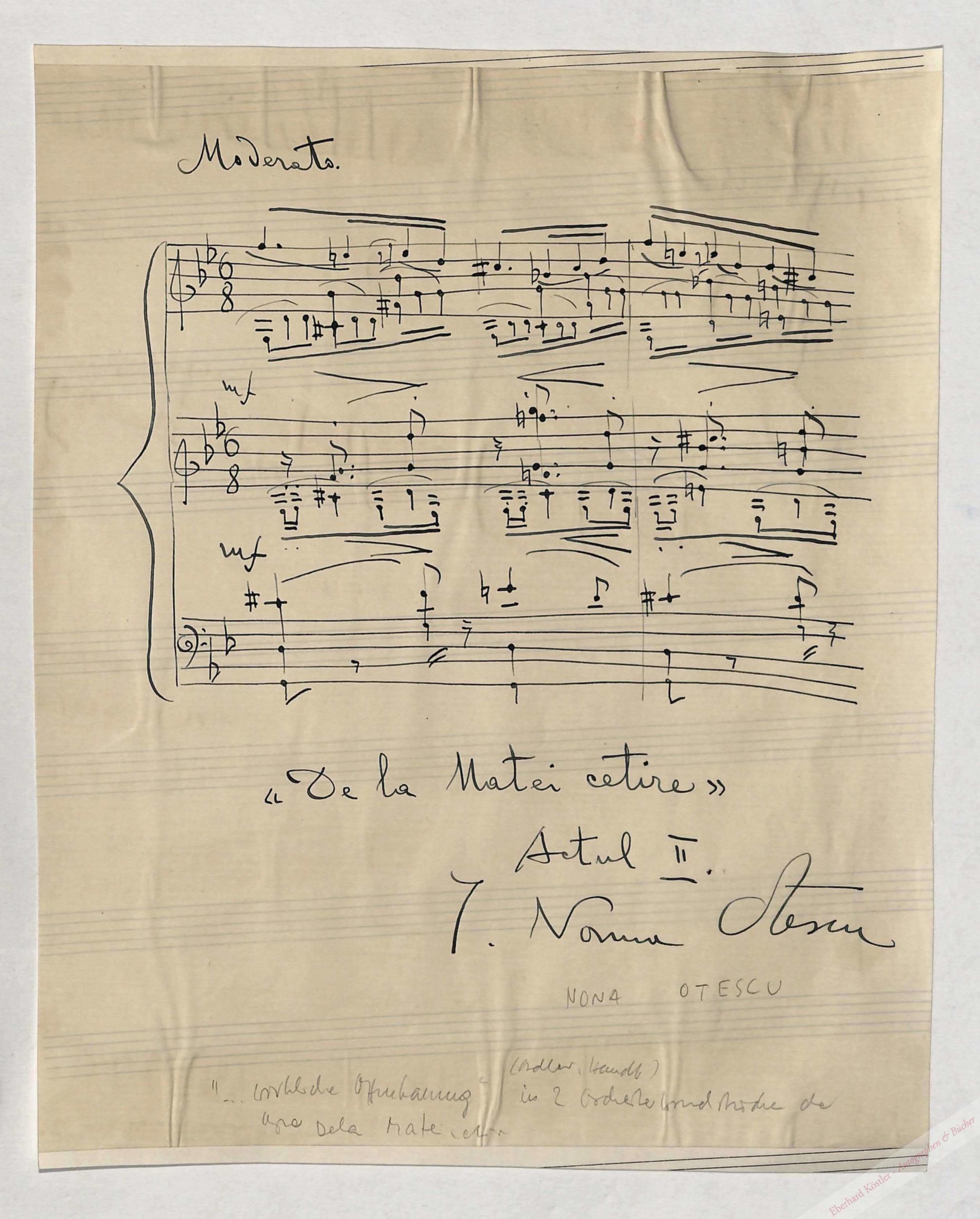 Adler, Handbuch II: „Der eigentlich rumänische Charakter aber, der in der Kopositionstechnik Otescus vom Volksgeist fein und witzig gesättigt ist, zeigte sich als wirkliche Offenbarung in 2 Orchesterbruchstücken aus der Oper ‚De la Matei cetire‘.“ Aus dem zweiten stammt das vorliegende Blatt.