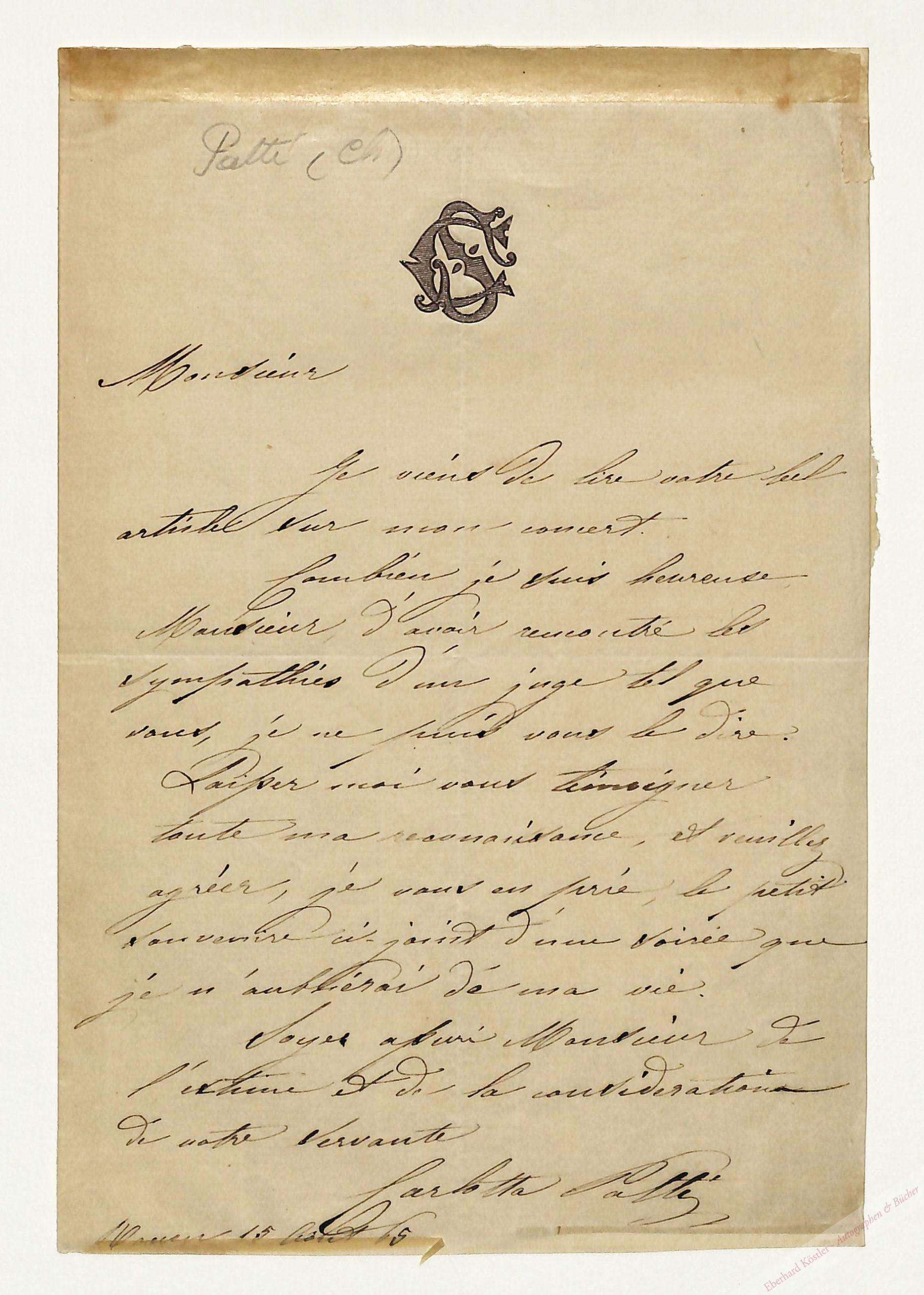 Dank für eine positive Besprechung ihres jüngsten Konzertes: „[…] Je vien de lire votre bel article sur mon concert. Combien je suis heureuse Monsieur d’avoir rencontrè des sympathies d’un juge bel que vous, je ne suis vous le dire […]“ – Carlotta Patti war die ältere Schwester der großen Sopranistin Adeline Patti, Tochter des Opernregisseurs Salvatore Patti und der Sängerin Barili. In den 60er Jahren unternahm sie ausgedehnte Konzertreisen nach England (Covent Garden) und Amerika.