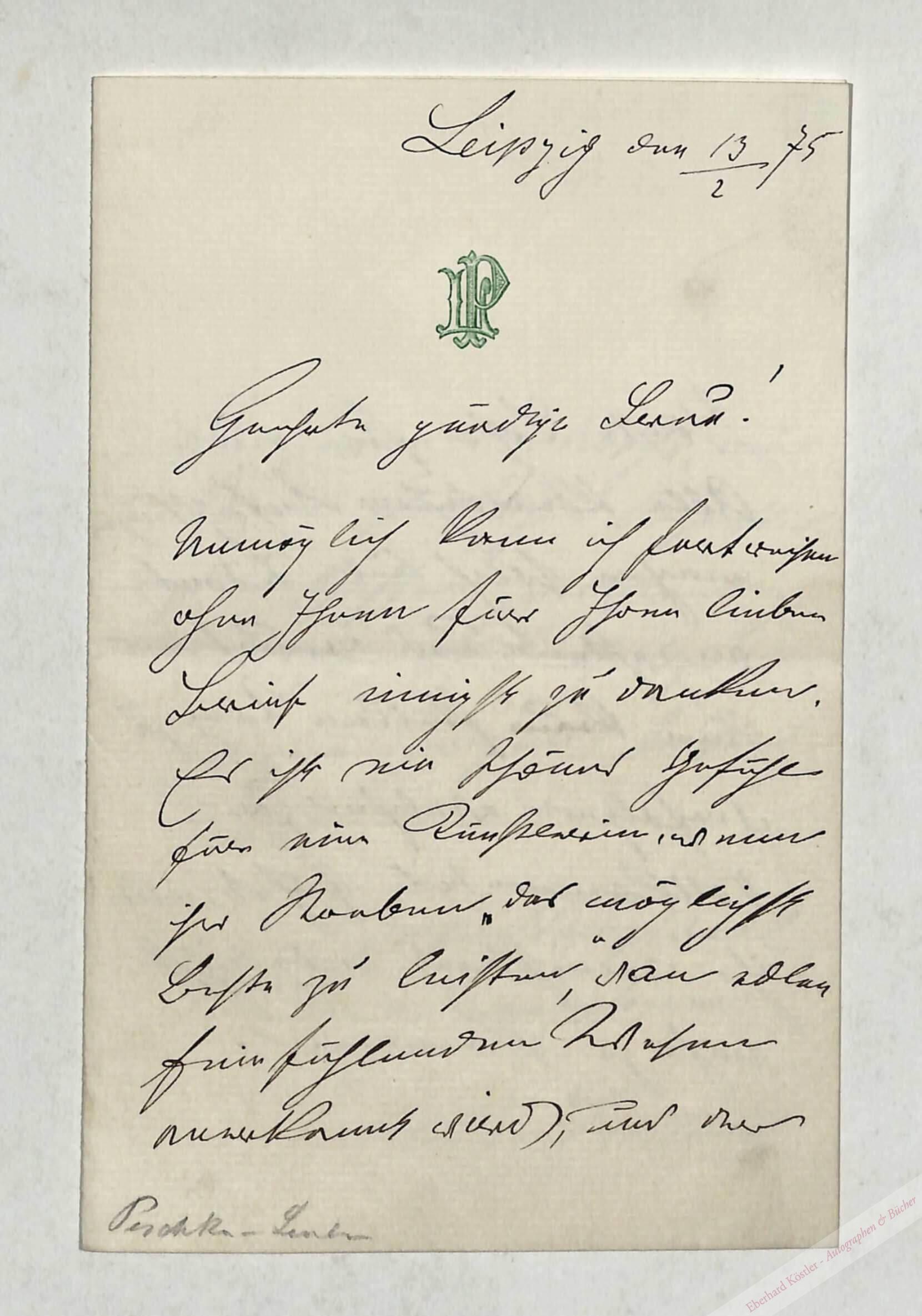 Eigenhändiger Brief mit Unterschrift Leipzig, 13. II. 1875, 18 x 11,5 cm. 3 Seiten. Doppelblatt. Mit grün gedrucktem Briefkopf ..