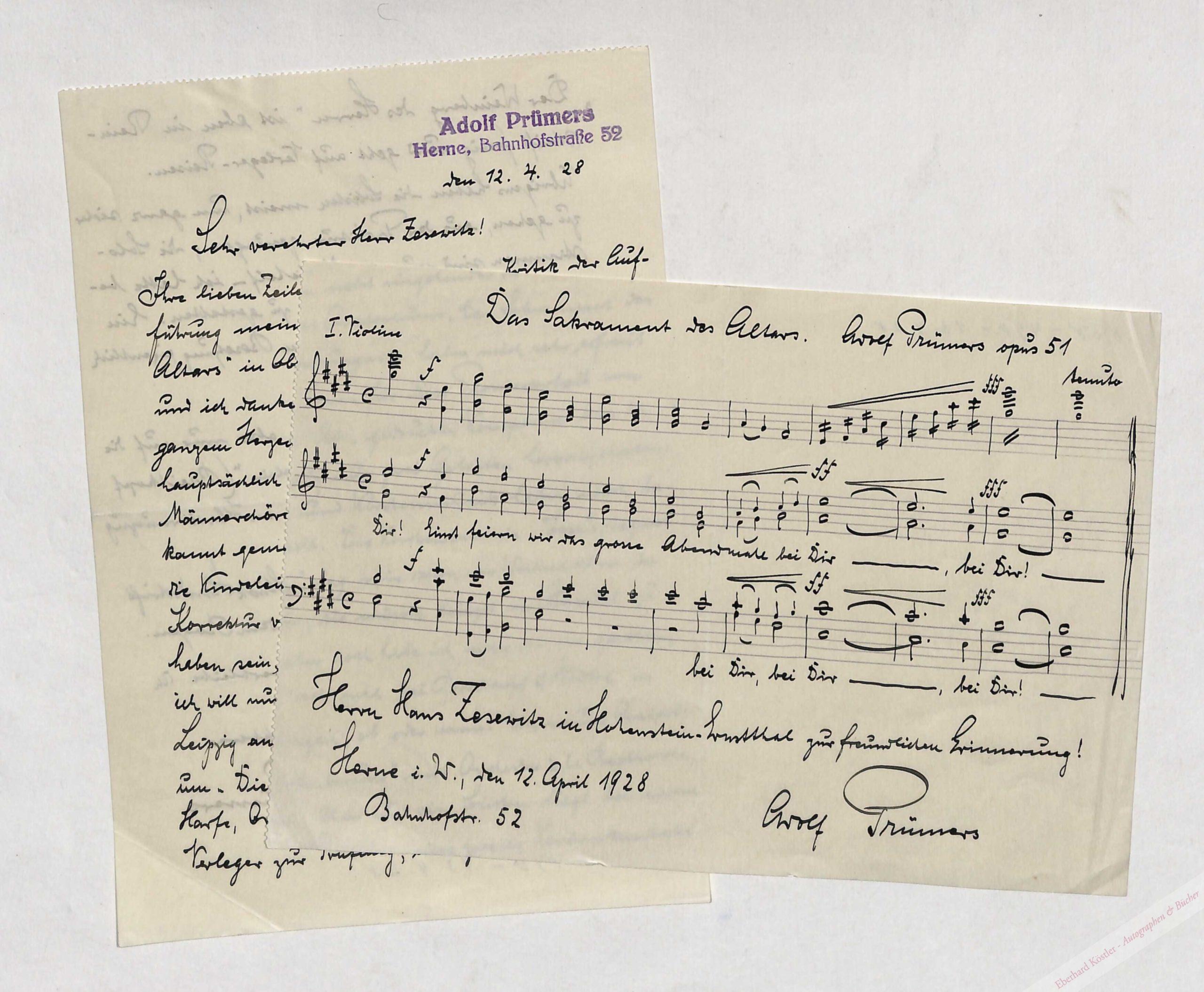 Das Notenzitat ist aus dem Oratorium „Das Sakrament des Altars“ Op. 51. Albumblatt und Brief sind an den Karl-May-Forscher Hans Zesewitz (1888-1976).