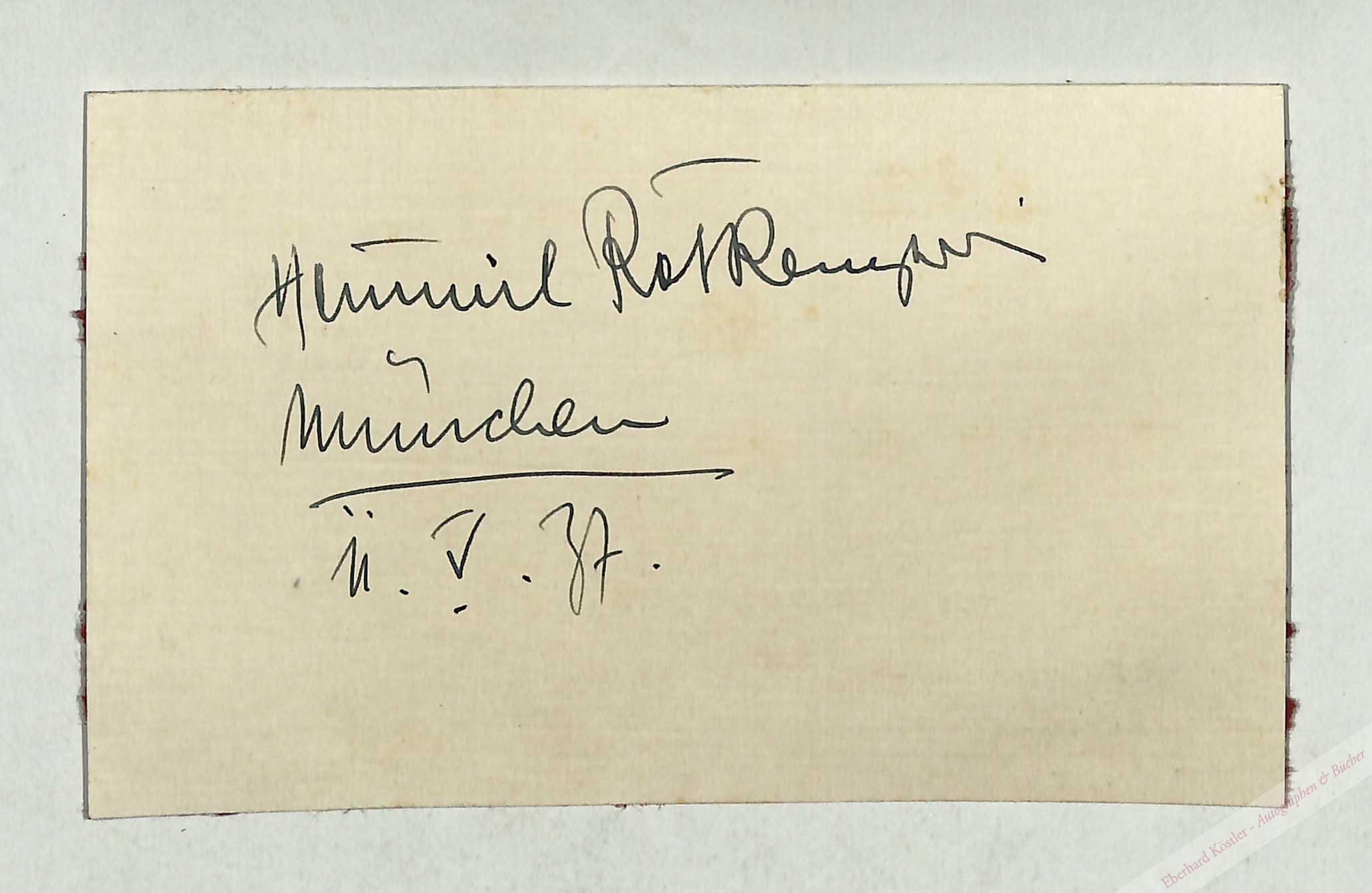 Eigenh. Schriftstück mit N. München, 11. V. 1937, 9 x 15 cm. 1 Seite. Aufgeklebt auf oten Karton..