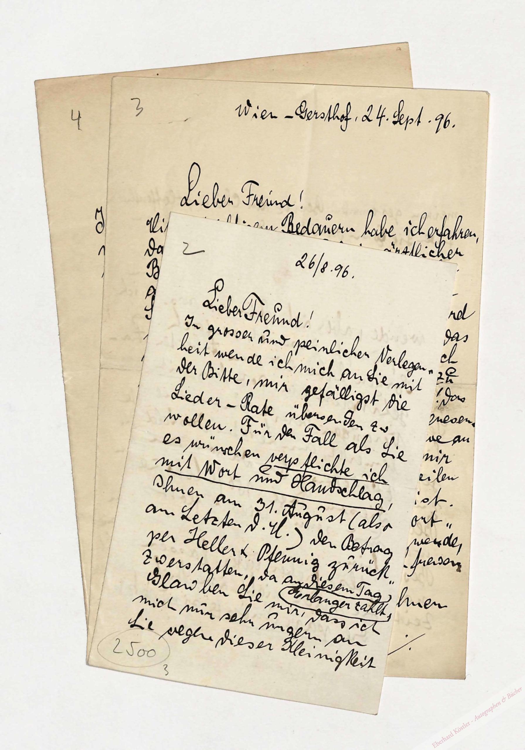 Der erfolgreiche Operettenkomponist („Das süße Mädel“, „Die Sprudelfee“) wegen Geldnot und in Sachen eigener Kompositionen an seinen Verleger Lewy in Wien.