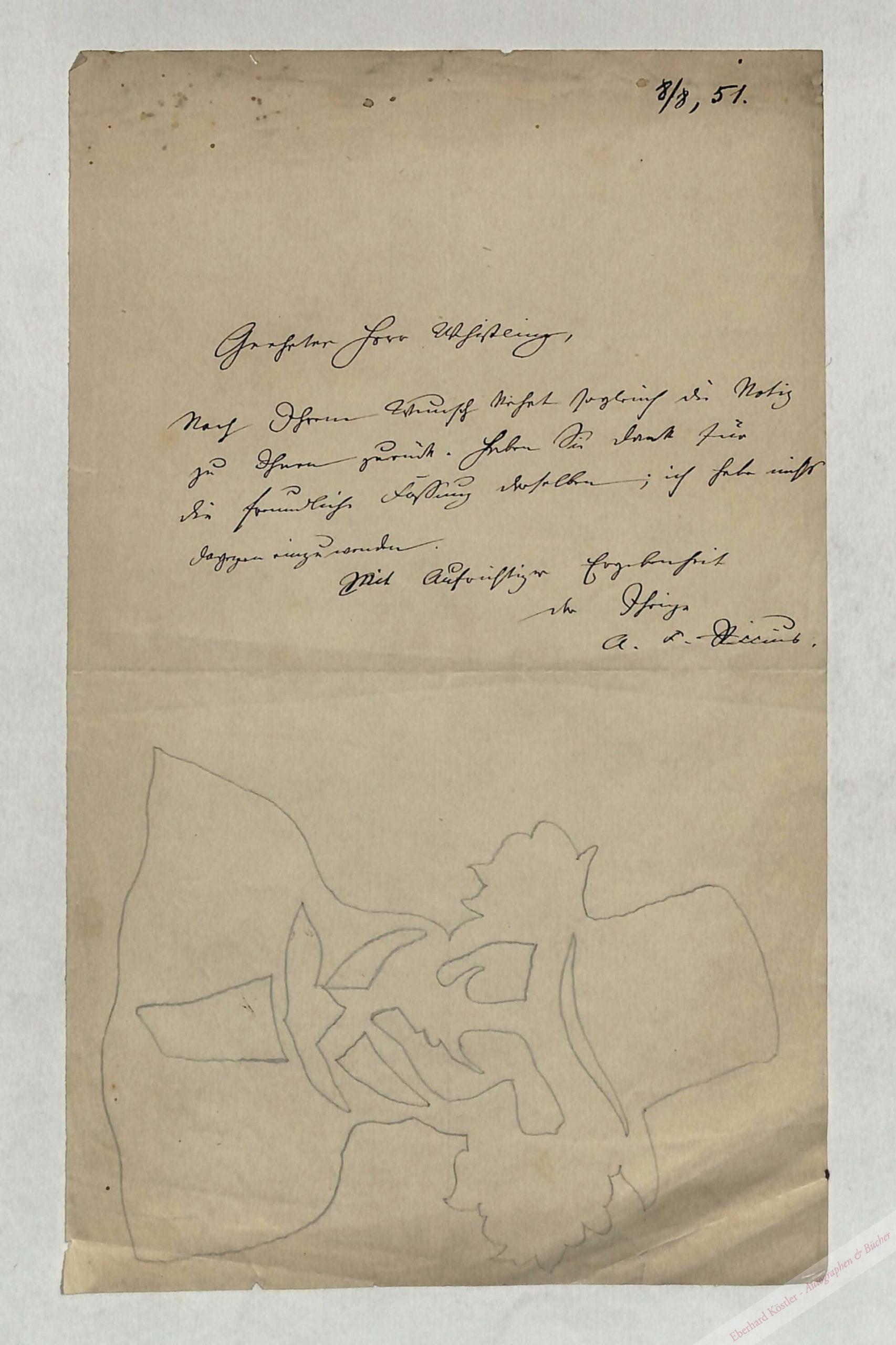 Rücksendung einer Notiz: „… Nach Ihrem Wunsch kehrt zugleich die Notiz zu Ihnen zurück. Haben Sie Dank für die freundliche Sendung derselben…“. – Riccius war ab 1849 Dirigent beim Leipziger ‚Euterpe‘ T.K. Orchester. Er wechselte im Jahre 1854 ans Leipziger Stadttheater, wo ihm die Leitung des Orchesters angeboten worden war. Diese Position hatte er bis 1864 inne. So gehörte er 1859 zu den 4 Festdirigenten des renommierten Hauses, neben Franz Liszt, David Hermann Engel und Carl Riedel.