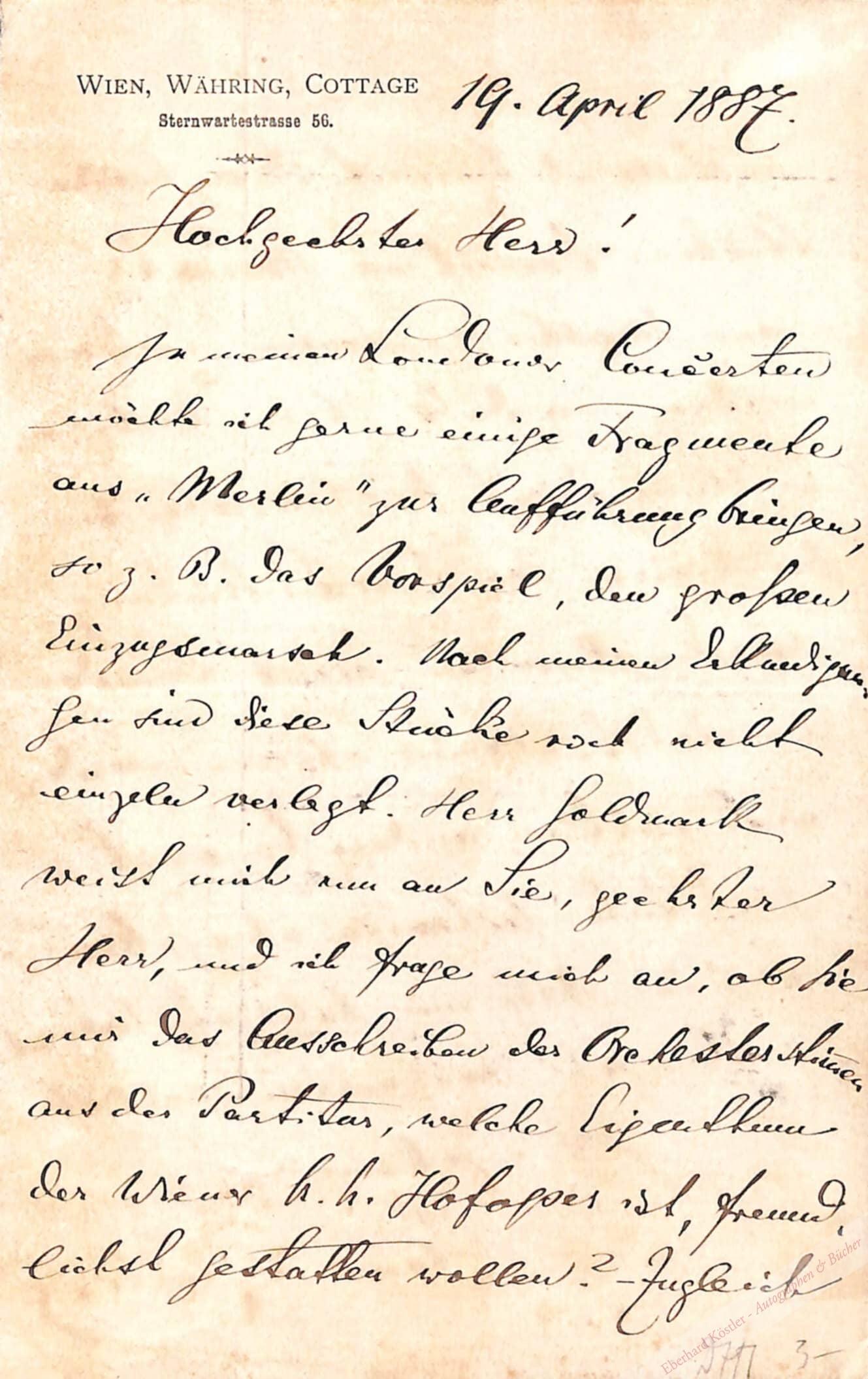 An den Verlag J. Schuberth in Leipzig über die Oper „Merlin“ (1886) von Carl Goldmark: „[…] In meinen Londoner Concerten möchte ich gerne einige Fragmente aus ‚Merlin‘ zur Aufführung bringen, so z. B. das Vorspiel, den großen Einzugsmarsch. Nach meinen Erkundigungen sind diese Stücke noch nicht einzeln verlegt. Herr Goldmark weist mich nun an Sie […] und ich frage mich an, ob Sie mir das Ausschreiben der Orchesterstimmen aus der Partitur, welche Eigenthum der Wiener k. k. Hofoper ist, freundlichst gestatten wollen? – Zugleich bestelle ich hiermit diese beiden Stücke, Vorspiel und Marsch, wenn dieselben gestochen erscheinen werden, so das Ihrer Verlagshandlung durch das Ausschreiben der Stimmen vor Veröffentlichung dieser einzelnen Nummern kein Schade erwächst. Meine Stimmen werden auch nicht an andere Concert-Institute leihweise abgegeben […] Ich füge noch hinzu, daß Herr Goldmark selbst es war, der mir es nahe legte, Bruchstücke aus seinem neuesten Werke in meinen Londoner Concerten zur Aufführung zu bringen. Für die Weiterverbreitung dieser Oper wird eine Aufführung einzelner Nummern in den ‚Richter-Concerten nur förderlich sein […]“ – Richter wirkte in England als Wegbereiter der Werke Wagners. 1879-97 leitete er in London einen später „Richter Concerts“ genannten Konzertzyklus. – Respektblatt mit Eingangsvermerk.