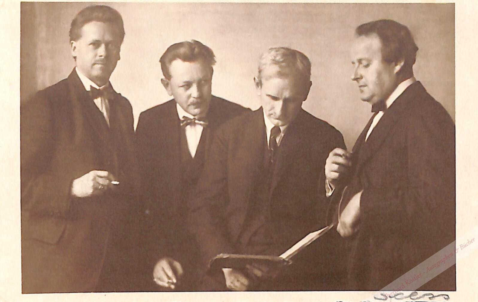 An Walther Josephson, den Musikdirektor des Konservatoriums in Duisburg, mit einer Absage für eine Einladung, „da ich mich in Duisburg schon mit Freunden verabredet habe.“ – Rückseitig ein Photo des Wendling-Quartetts, dessen Mitglied Saal war. Das Quartett bestand aus Karl Wendling (1. Violine), Hans Michaelis, später Hermann Hubl (2. Violine), Philipp Neeter, später Ludwig Natterer (Bratsche) und Alfred Saal (Violoncello).