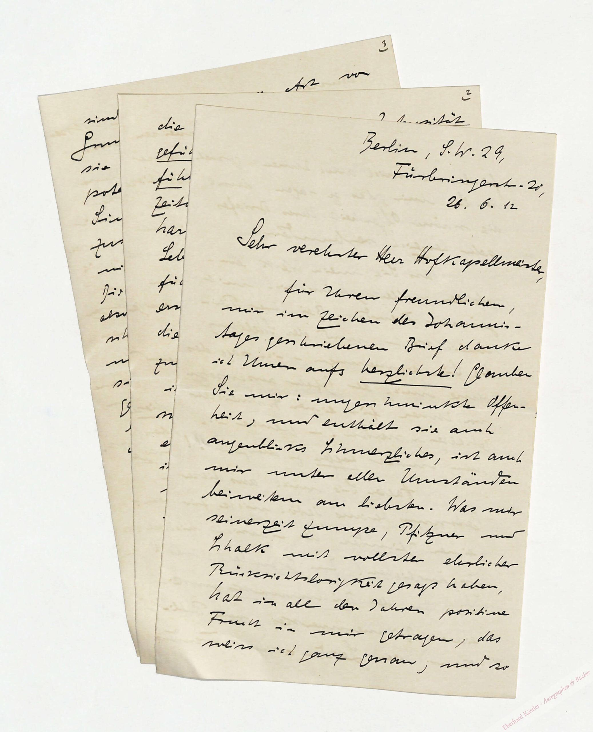 Ein umfangreicher Brief Schattmanns an Peter Raabe mit eingehender Darstellung seiner musikalischen Situation. „… Was mir seinerzeit Zumpe, Pfitzner und Schalk mit vollster ehrlicher Rücksichtslosigkeit gesagt haben, hat in all den Jahren positive Frucht in mir getragen…“. Wichtige Partien betreffen seine neue Oper „Des Teufels Pergament“, die 1913 uraufgeführt wurde.