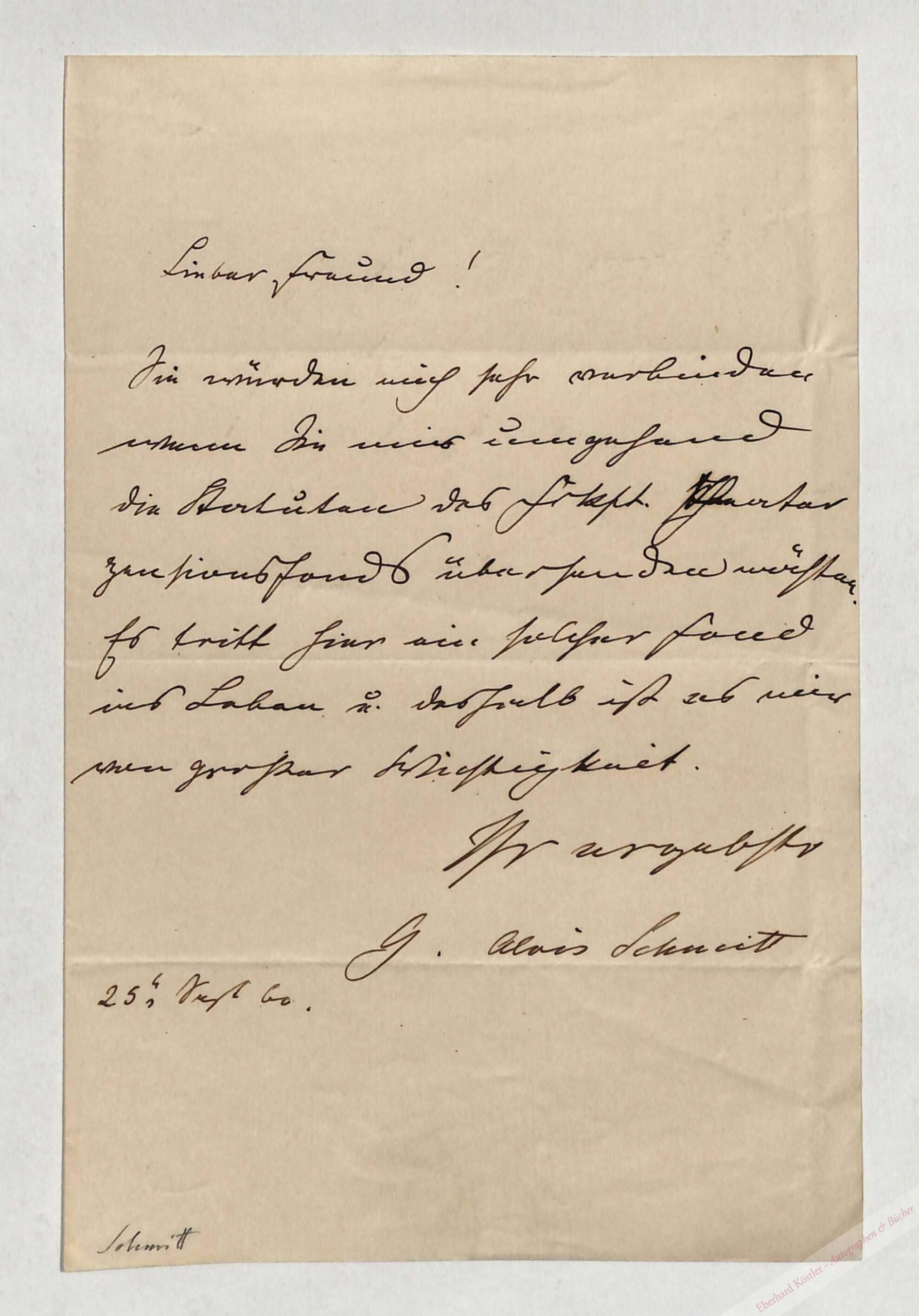 Bittet einen Freund, ihm „umgehend die Statuten des Frkft. Theaterpensionsfonds“ zu übersenden.