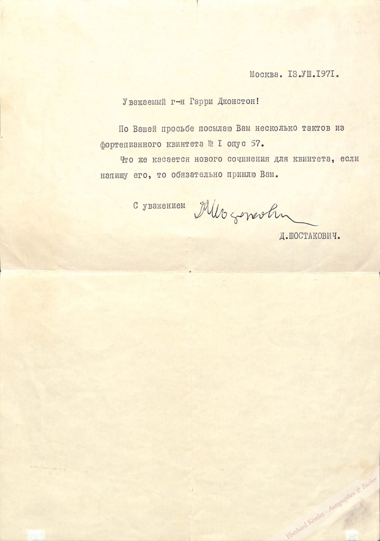 In Russisch an den Sammler Harry Johnston in New Bedford, Mass. Übersetzung: „Auf Ihre Anfrage hin sende ich Ihnen einige Takte Musik aus dem Klavierquartett Nr. 1, op. 67. Was eine neue Quintett-Komposition anlangt, so werde ich sie Ihnen senden, wenn ich sie geschrieben habe […]“ – Gut erhalten. – Sehr selten.
