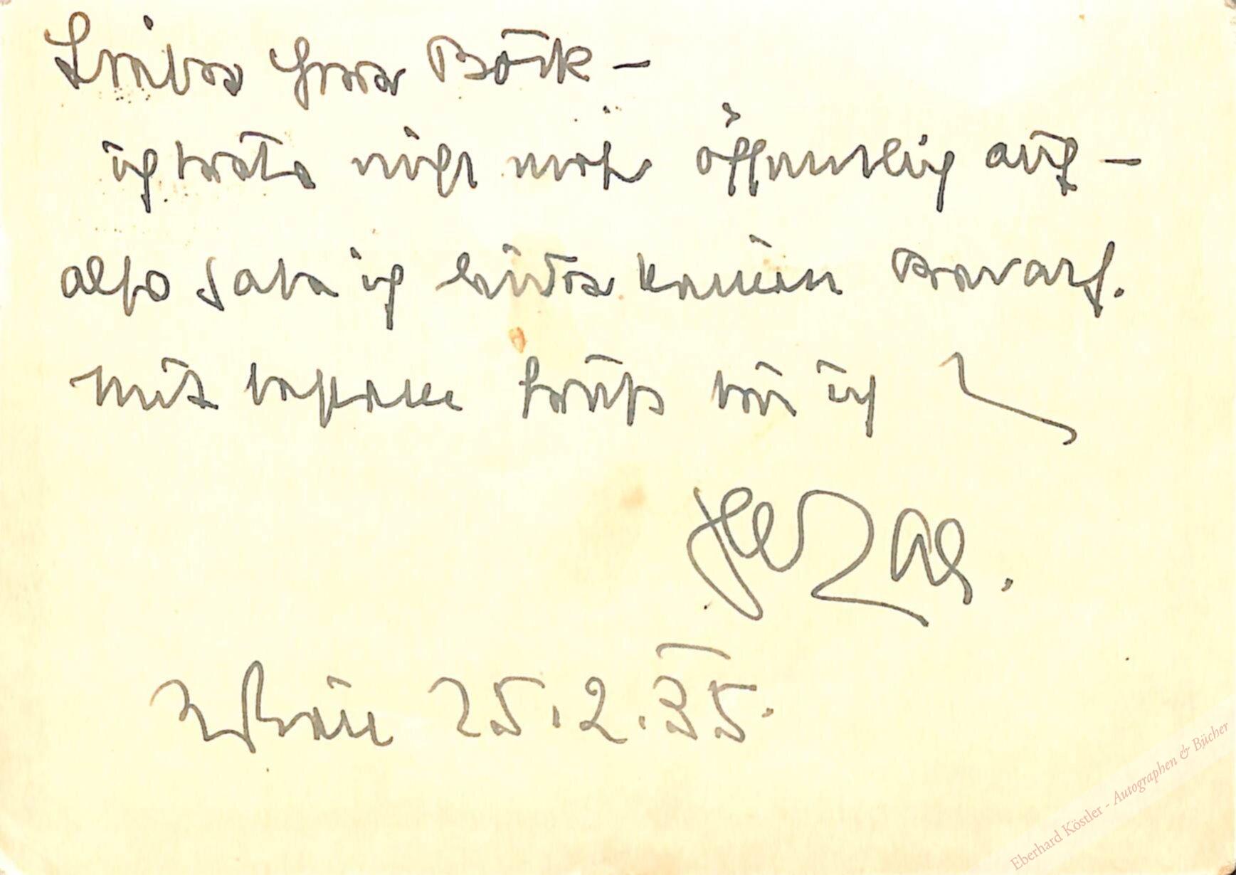 An den Komponisten Franz Böck in Wien: „[…] ich trete nicht mehr öffentlich auf – also habe ich leider keinen Bedarf. Mit bestem Gruß bin ich Ihr LSlezak.“