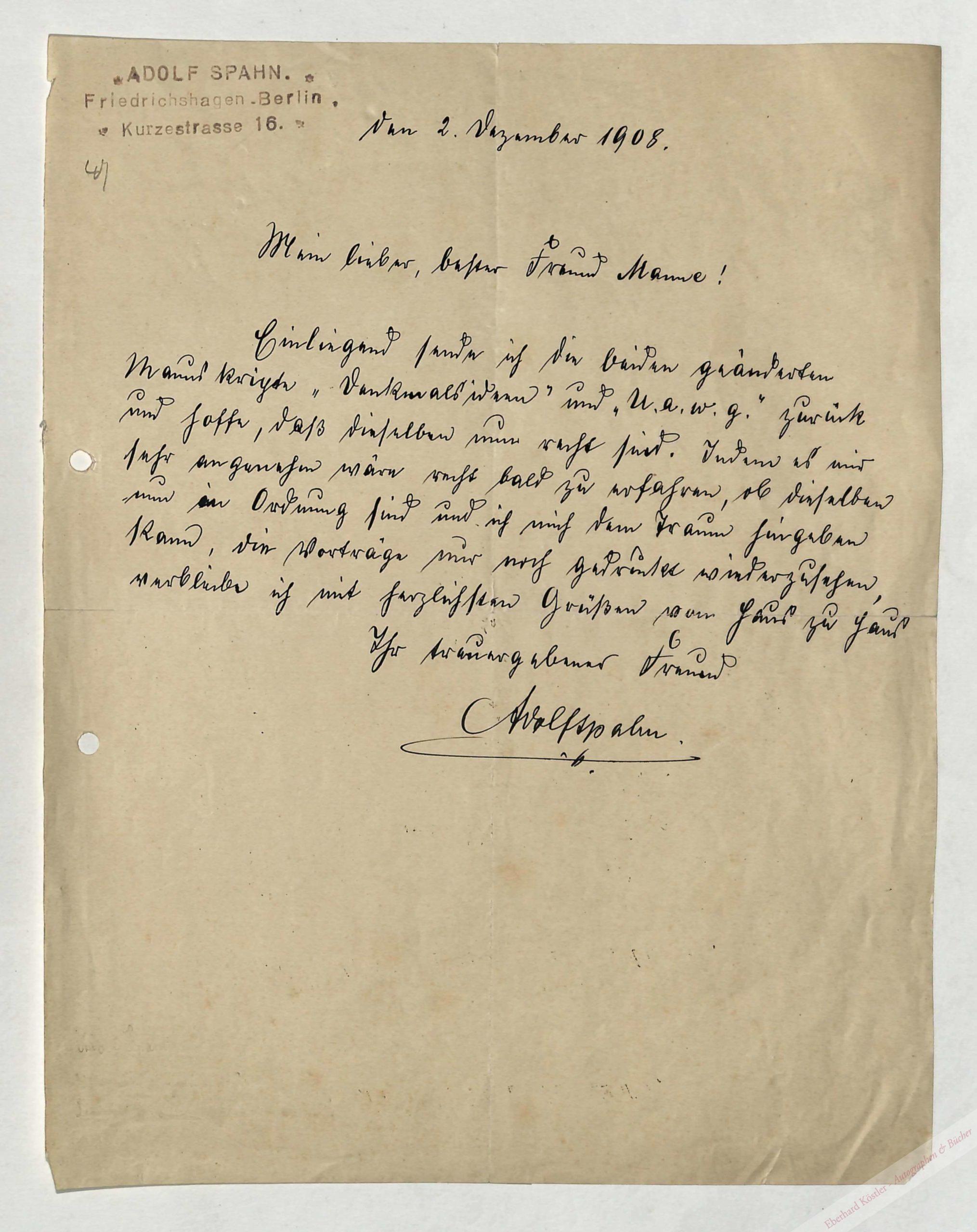 Der Varietékünstler sendet seinem Freund „Manne“ seine Vorträge „Denkmalsideen“ und „U.a.w.g.“ zurück in der Hoffnung, sie bald gedruckt zu sehen.