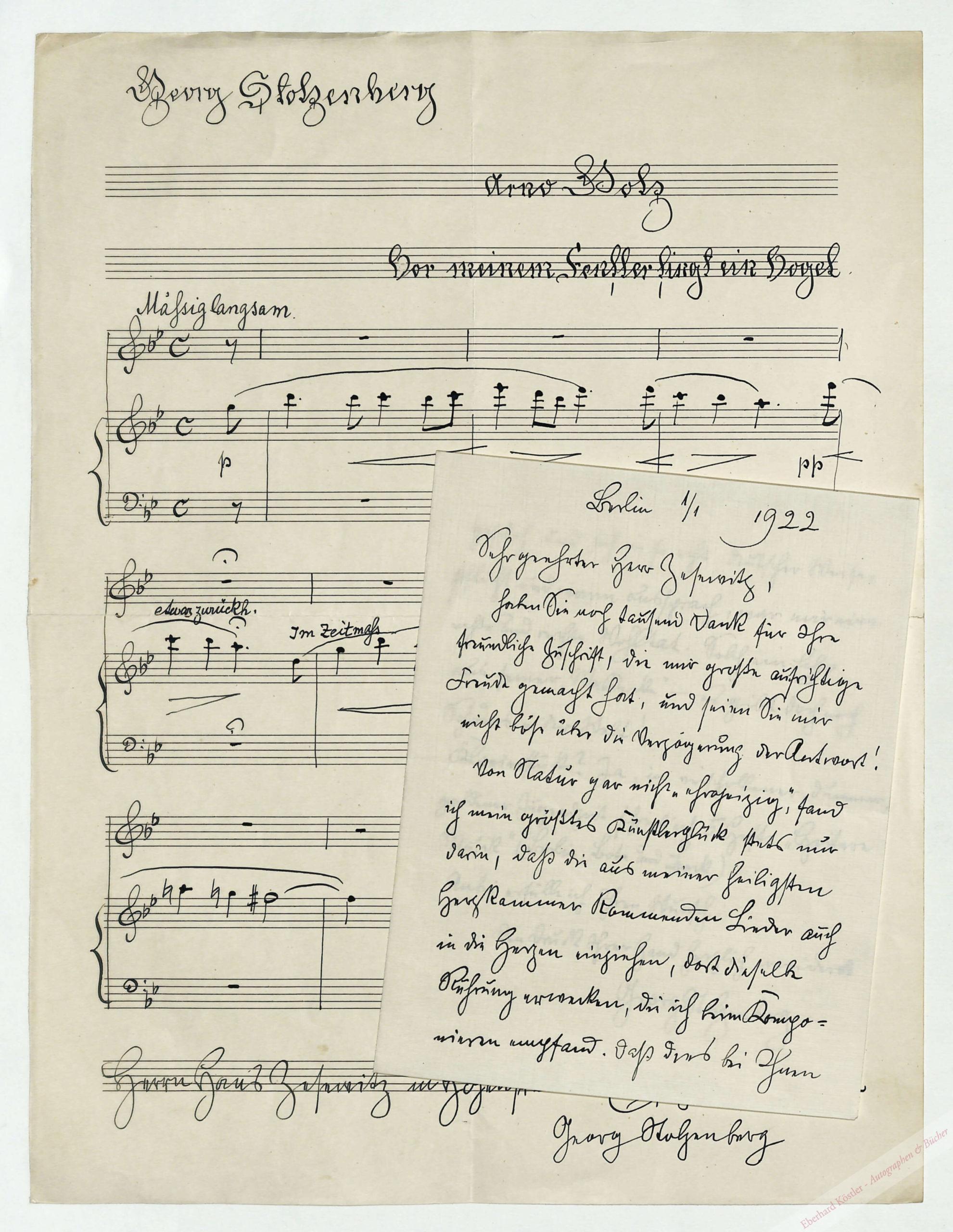 Die ersten 10 Takte des Liedes „Vor meinem Fenster singt ein Vogel“ (Arno Holz) für eine Singstimme und Klavier. – Beiliegend ein eigenh. Brief (2 Seiten) mit U.