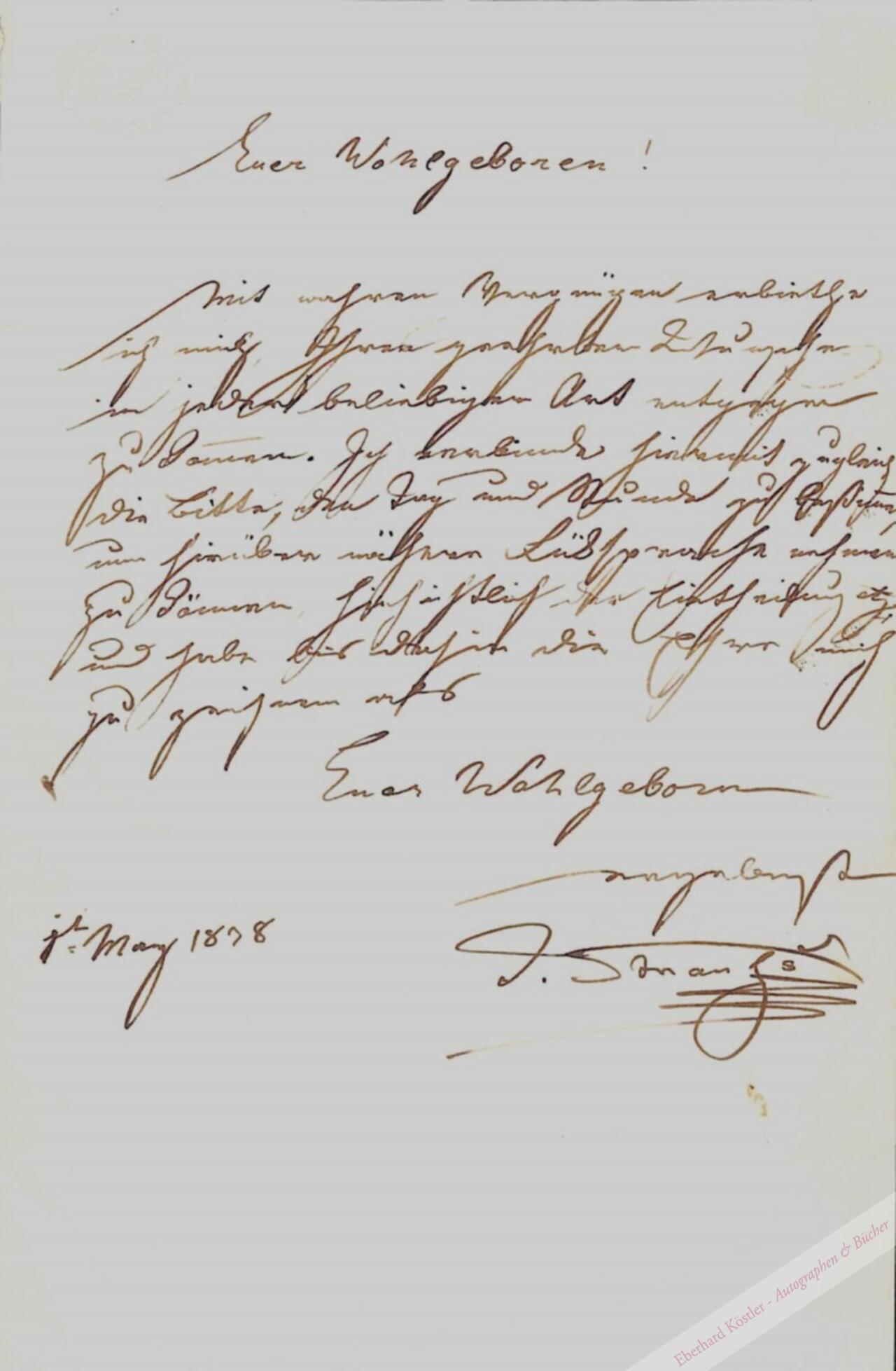 An den Pianisten und Komponisten Ignaz Moscheles (der 1828 einen „Valse à la Strauss“ komponiert hatte): „[…] Mit wahrem Vergnügen erbiethe ich mich Ihrem geehrten Wunsche in jeder beliebigen Art entgegen zu kommen. Ich verbinde hiermit zugleich die Bitte, den Tag und Stunde zu bestimmen um hierüber nähere Rücksprache nehmen zu können, hinsichtlich der Einteilung etc. und habe bis dahin die Ehre mich zu zeigen als Euer Wohlgeboren ergebenster […]“ – Im Jahr 1838 unternahm Johann Strauss eine erfolgreiche siebenmonatige Konzerttournee durch England. Von seiner Ankunft im April 1838 bis Ende Juli gab er allein in London 79 Konzerte, u. a. mit einem Widmungswalzer bei dem Krönungsball für Königin Victoria am 10. Mai 1823. Die Tourneeanstreingungen führten bei ihm zu einem nervlichen Zusammenbruch. – Briefe von Johann Strauss Vater sind sehr selten.