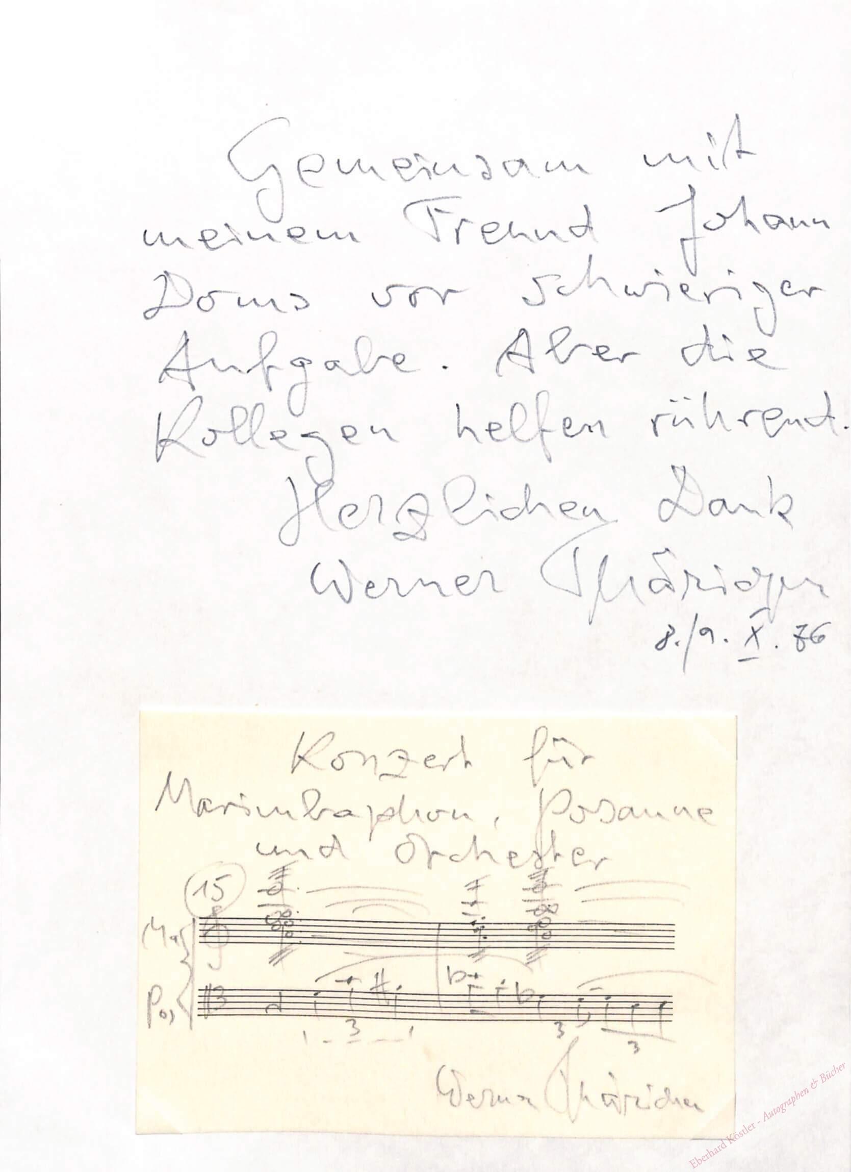 Zitat aus dem Konzert für Marimbaphon, Posaune und Orchester op. 53, aus Anlaß der Erstaufführung mit den Berliner Philharmonikern unter W. Sinaiski und mit Johann Doms, von denen je ein Autograph beiliegt.