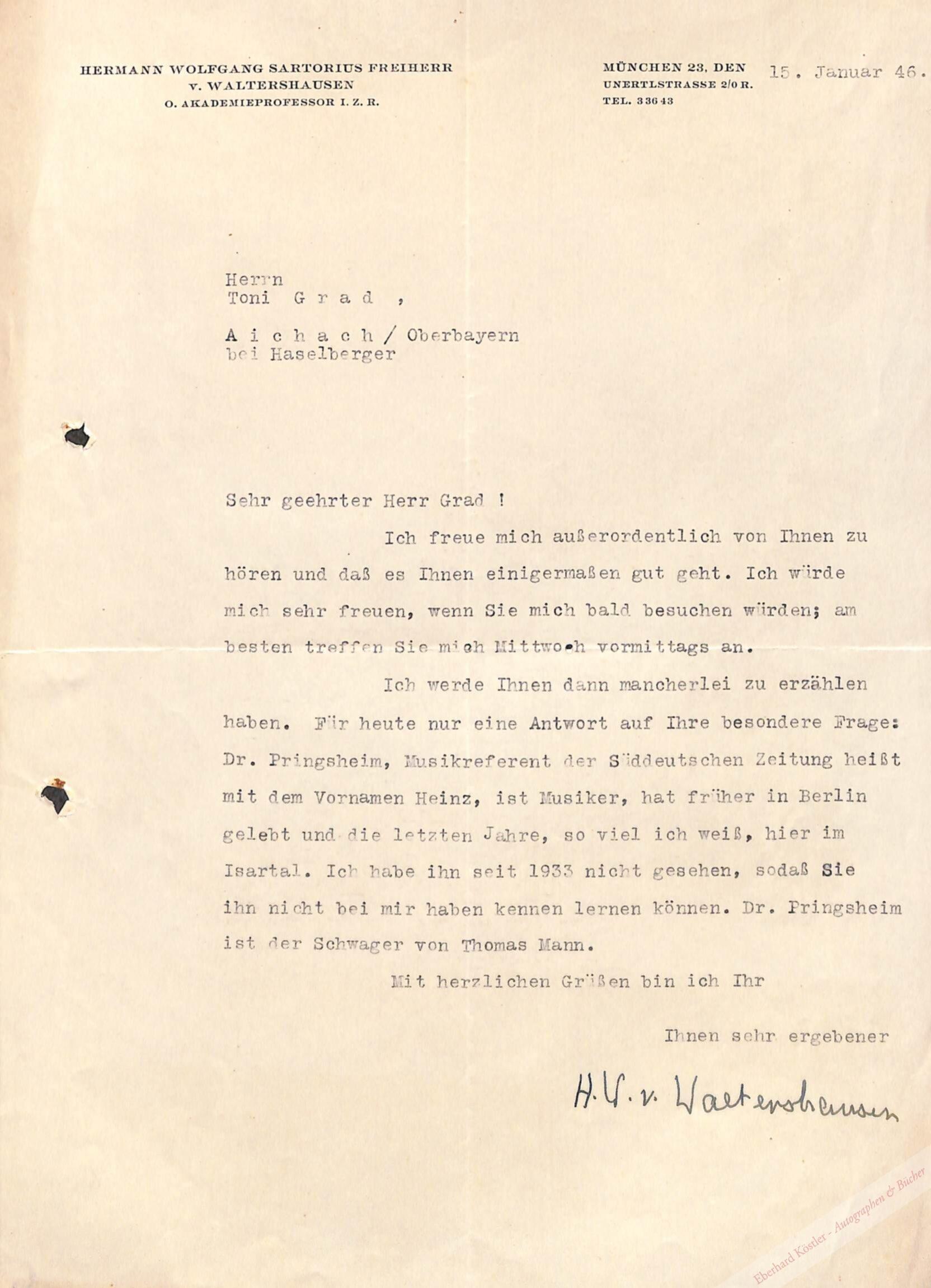 Maschinengeschriebener Brief mit eigenhändiger Unterschrift München, 15. I. 1946, 4°. 1 Seite.