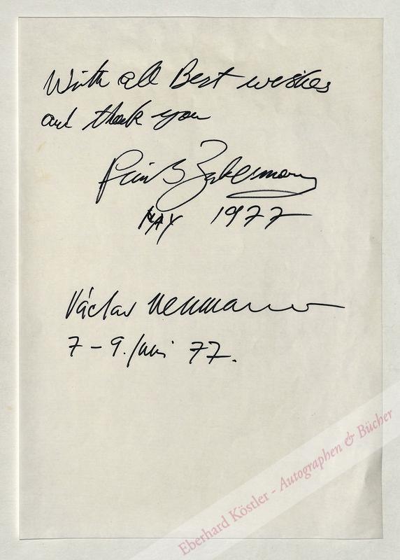Auf demselben Blatt Namenszug von Vaclav Neumann. – Pinchas Zukermans Eltern überlebten das Warschauer Ghetto und das Konzentrationslager Auschwitz. Zuckerman wurde zunächst am Israelischen Konservatorium und der Musikakademie in Tel Aviv ausgebildet. 1962 ging er nach New York City, um an der Juilliard School of Music bei Ivan Galamian zu studieren. Von 1980 bis 1987 war Zukerman Dirigent des St. Paul Chamber Orchestra. Von 1998 bis 2015 war er Chefdirigent des National Arts Centre Orchestra in Ottawa. – Beiliegend ein Konzertprogramm.