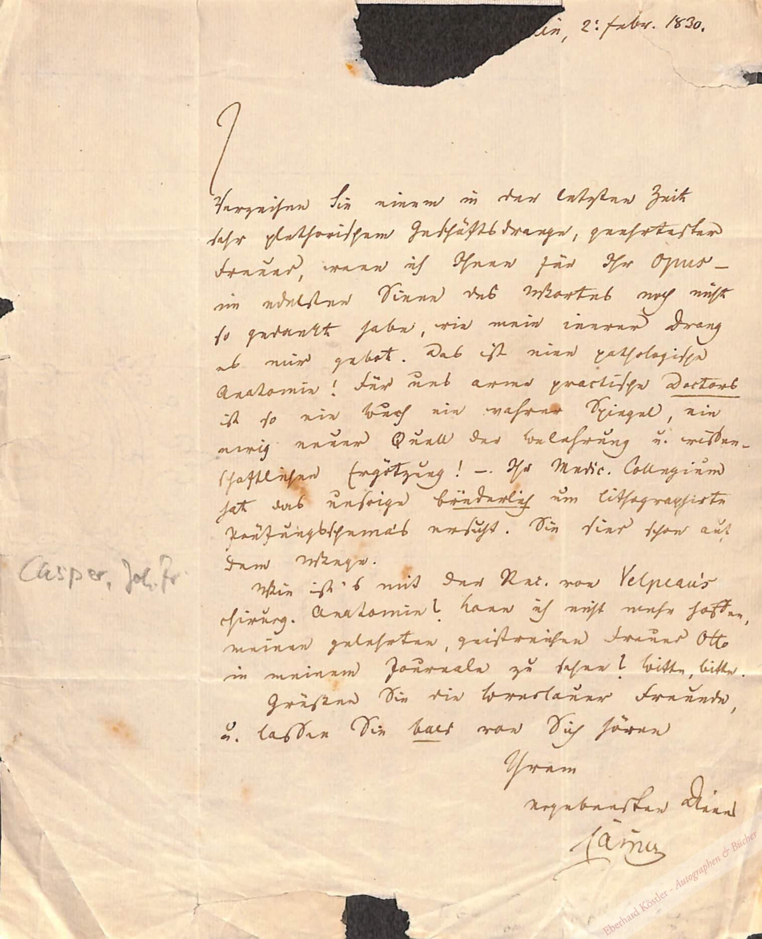 An den Anatomen Adolph Wilhelm Otto (1786-1845) in Breslau mit Dank und höchstem Lob für dessen „Pathologische Anatomie“. – Casper war ab 1825 Professor in Berlin und veröffentlichte ein „Praktisches Handbuch der gerichtlichen Medizin“. – Beiliegend ein diktierter Brief an denselben mit eigenh. Nachschrift und U., dat. Berlin 25. VIII. 1829, mit der Bitte, eine Rezension zu übernehmen.