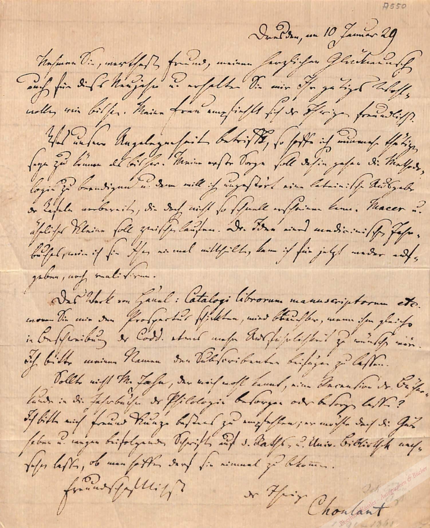 Interessanter Brief über seine literarische Tätigkeit, den Handschriftenkatalog von Hänel, einen Zeitschriftenplan sowie Rezensionen. – Choulant war Rektor der Königlich Chirurgisch-Medizinischen Akademie in Dresden und zugleich Geheimrat und Medizinalreferent im sächsischen Ministerium des Innern. Er gilt als einer der Väter der deutschen Medizingeschichtsschreibung. – Beiliegend: Ders., Eigenh. Leihschein für „Albrecht Dürer von menschlicher Proportion“.