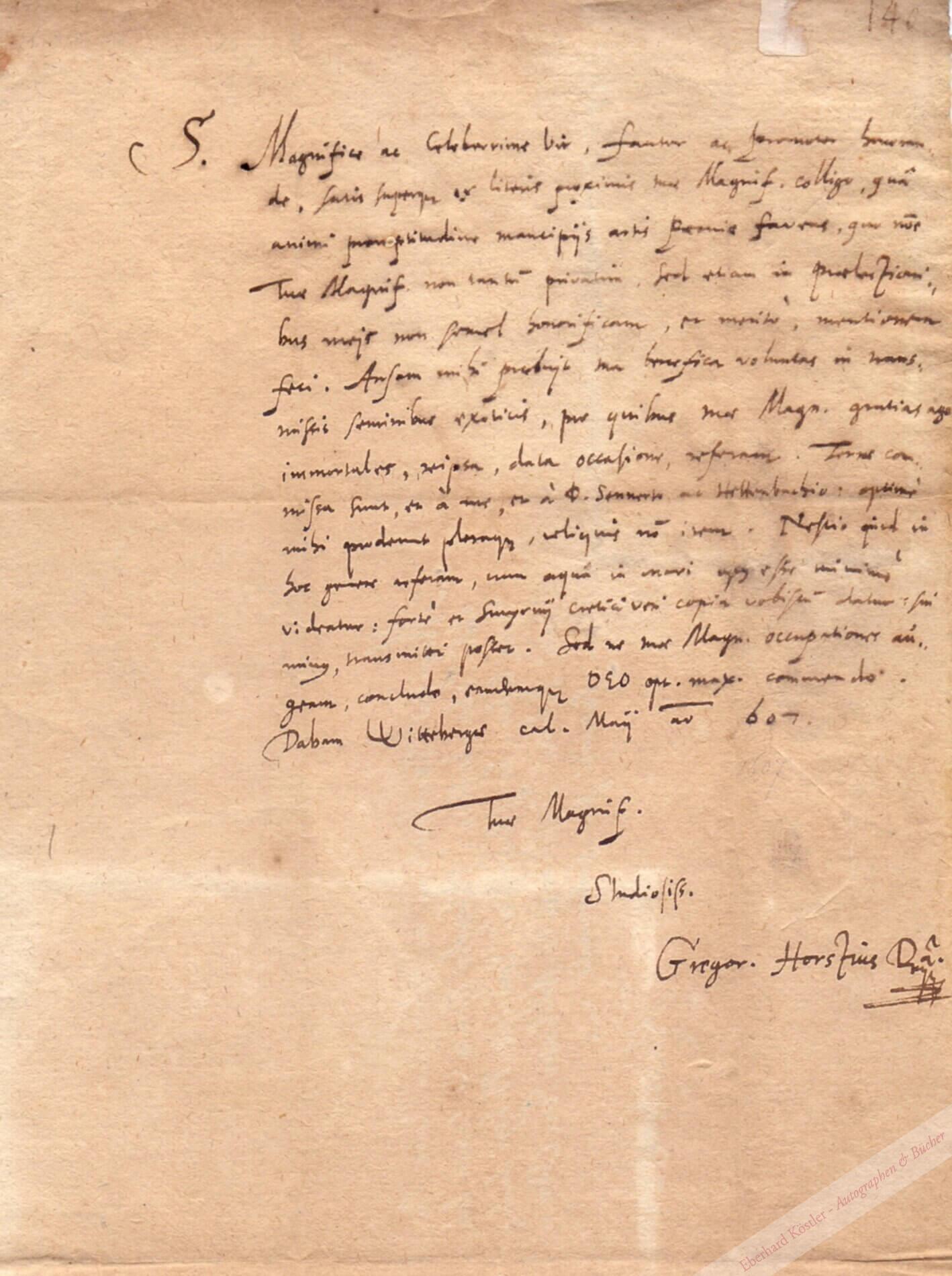 In lateinischer Sprache an den Mediziner und Freund von Kepler Johannes Oberndorffer (1549-1625) in Regensburg. – Aufgrund seiner herausragenden Tätigkeit als Mediziner und seiner für die Zeit sehr frühen Rationalisierung der medizinischen Wissenschaft, wurde Horstius von seinen Zeitgenossen als Practicus prudens (erfahrener Praktiker) und als „Äskulap der Deutschen“ tituliert. Er unternahm den Versuch, die hermetische Medizin des Paracelsus mit der klassischen hippokratischen Medizin zu vereinigen. Im Laufe seines Wirkens tritt eine Mathematisierung seiner Lehre der Physiologie und Anatomie ein, die in dieser Form erst die rationale Medizin des 18. Jahrhunderts bestimmen sollte. Er gilt damit neben Andreas Vesalius als Wegbereiter der Anatomie in der Neuzeit. Horstius wurde 1608 als Professor für Anatomie und Botanik nach Gießen berufen. Im Jahr darauf wurde er Leibarzt des Universitätsgründers Landgraf Ludwig V. von Hessen-Darmstadt, wodurch er erheblichen politischen Einfluss gewann. – Etw. gebräunt. – Sehr selten: Kalliope kennt nur seine 9 Briefe an Bauhin in Basel. Nicht im Handel nachweisbar.